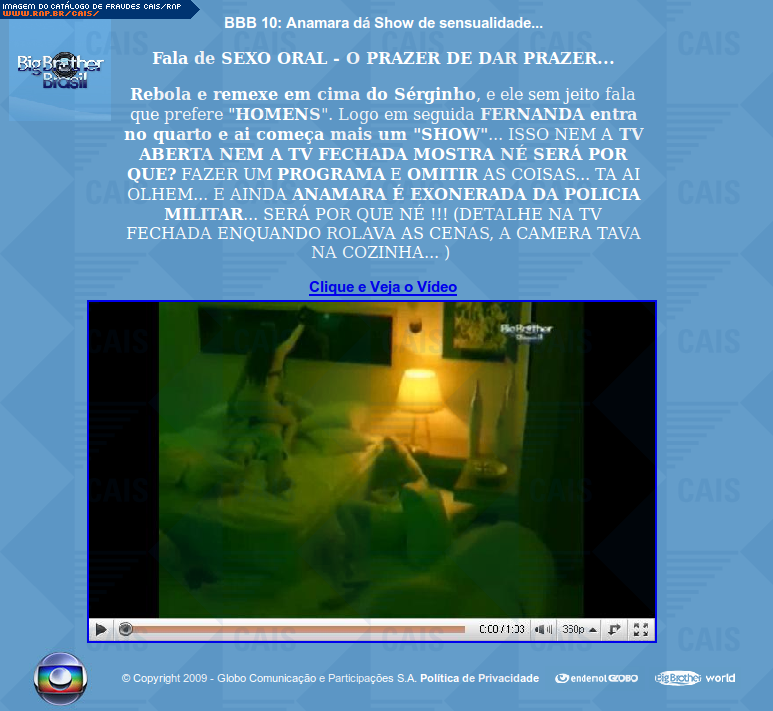 | comentário | Fraude mencionando suposto vídeo sensual de participante do Big Brother Brasil 10 que não teria sido transmitido nem em canal fechado. A mensagem fornece um link que daria acesso ao vídeo. O link leva a um malware identificado como BehavesLike:Win32.Malware... (leia mais) | |