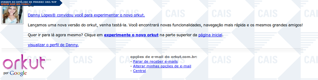 | comentário | Mensagem de alguem chamada Danny Lopes supostamente convidando a vítima para experimentar o novo Orkut. A fraude contém vários links para o perfil do remetente no Orkut, informações sobre o novo Orkut e para aderir ao novo sistema. Todos levam a um malware... (leia mais) | |