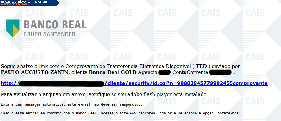 Esta página tem função informativa e educativa. Exibe uma coleção de imagens de phishing scam (fraudes eletrônicas) ou malware (código malicioso) veiculados por meio de spam (e-mail não-solicitado). Trata-se de conteúdo exemplificativo, não exaustivo, uma vez que não é possível contemplar todos os casos de fraudes existentes. Assim, caso você tenha conhecimento de um exemplar que não esteja aqui presente, isto não significa que não seja válido ou real. Inclusive incentivamos que você o envie para análise do CAIS para que, se for o caso, passe a integrar o nosso acervo.