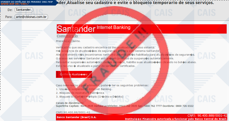 | assunto | Internet Banking Santander,Atualise seu cadastro e evite o bloqueio temporario de seus serviços. | |