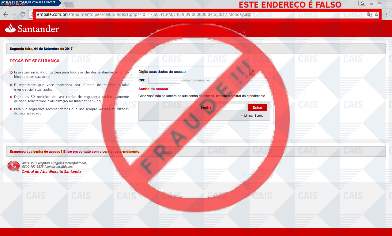 Esta página tem função informativa e educativa. Exibe uma coleção de imagens de phishing scam (fraudes eletrônicas) ou malware (código malicioso) veiculados por meio de spam (e-mail não-solicitado). Trata-se de conteúdo exemplificativo, não exaustivo, uma vez que não é possível contemplar todos os casos de fraudes existentes. Assim, caso você tenha conhecimento de um exemplar que não esteja aqui presente, isto não significa que não seja válido ou real. Inclusive incentivamos que você o envie para análise do CAIS para que, se for o caso, passe a integrar o nosso acervo.