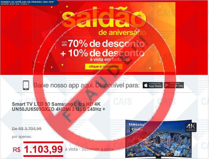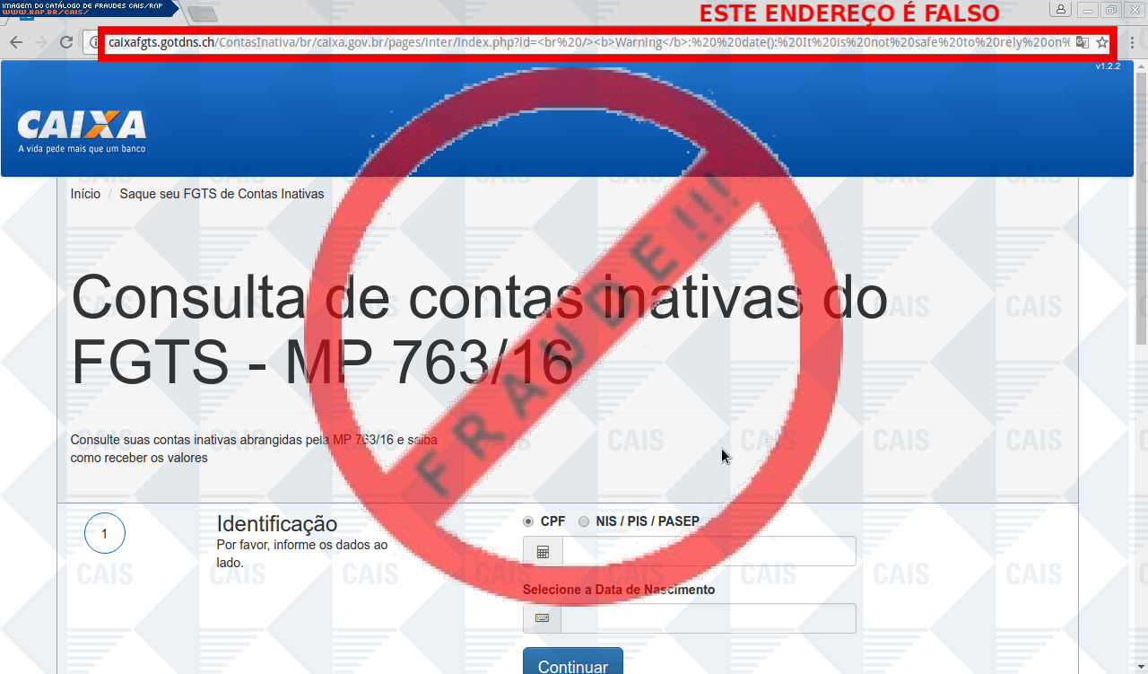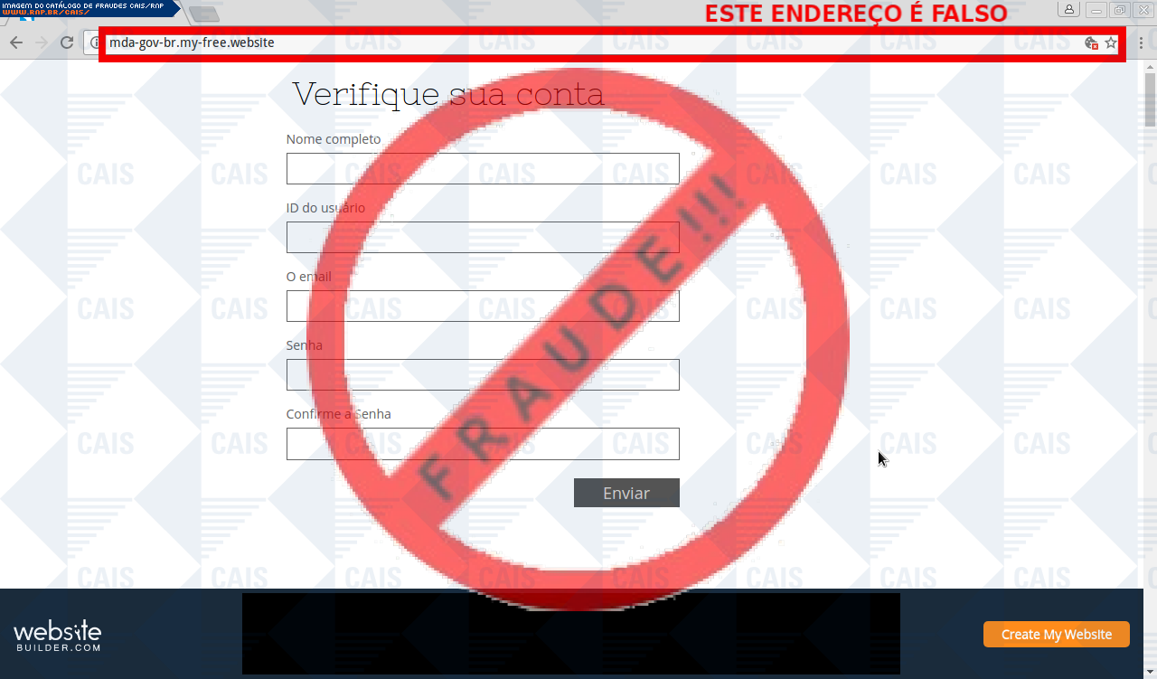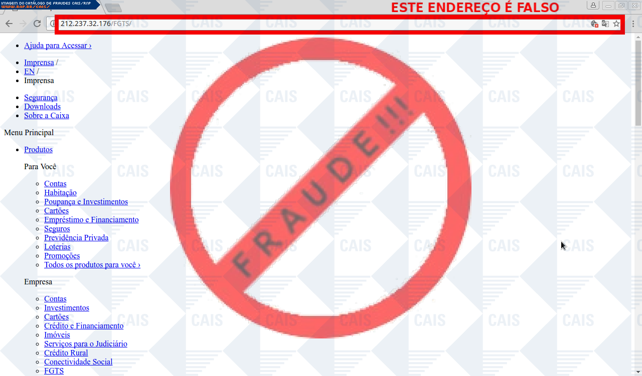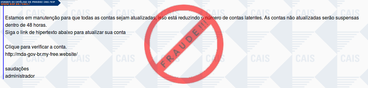 Esta página tem função informativa e educativa. Exibe uma coleção de imagens de phishing scam (fraudes eletrônicas) ou malware (código malicioso) veiculados por meio de spam (e-mail não-solicitado). Trata-se de conteúdo exemplificativo, não exaustivo, uma vez que não é possível contemplar todos os casos de fraudes existentes. Assim, caso você tenha conhecimento de um exemplar que não esteja aqui presente, isto não significa que não seja válido ou real. Inclusive incentivamos que você o envie para análise do CAIS para que, se for o caso, passe a integrar o nosso acervo.