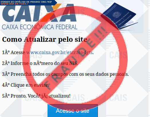 | comentário | A vítima recebe uma mensagem informando para atualizar os dados do FGTS e disponibiliza um link para consulta do extrato, no entanto a página é falsa criada para roubar informações da vítima. | |