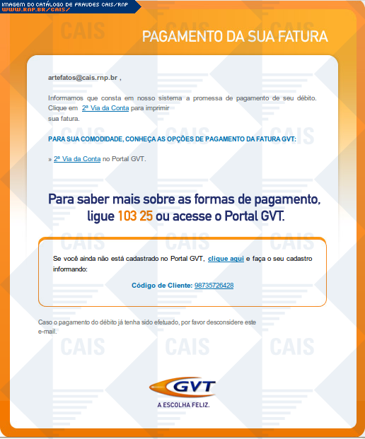 | comentário | Mensagem falsa em nome da GVT contendo um link para a segunda via de uma fatura. O link leva ao malware Win32:VB-RLG (Avast5). | |