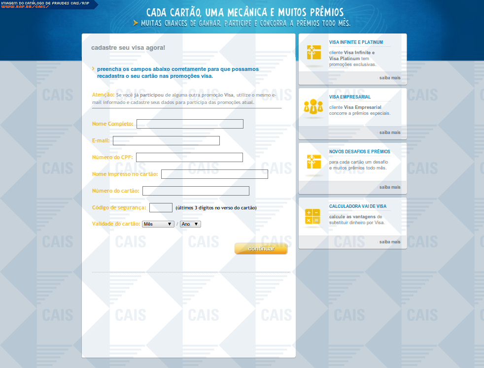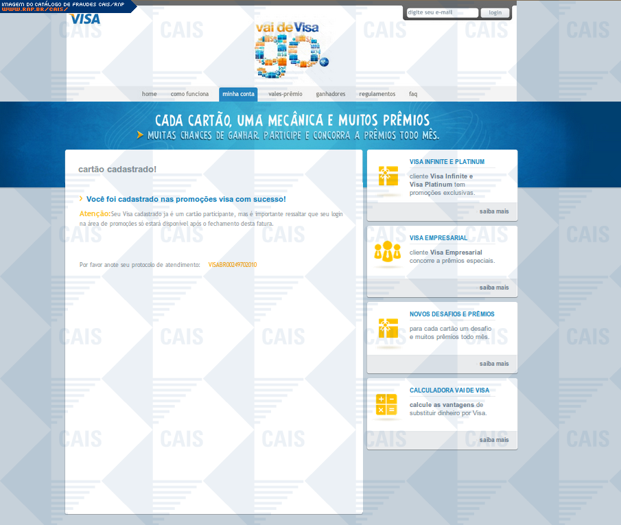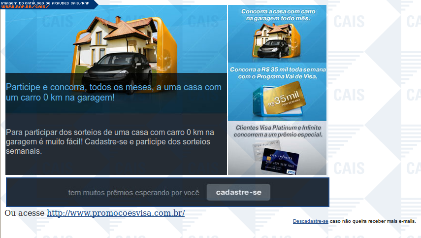 | comentário | Fraude que usa o nome da empresa de cartões Visa para aliciar a vítima a se cadastrar em supostas promoções. A mensagem contém um link que leva a uma página falsa destinada a roubar dados do cartão de crédito da vítima. | |