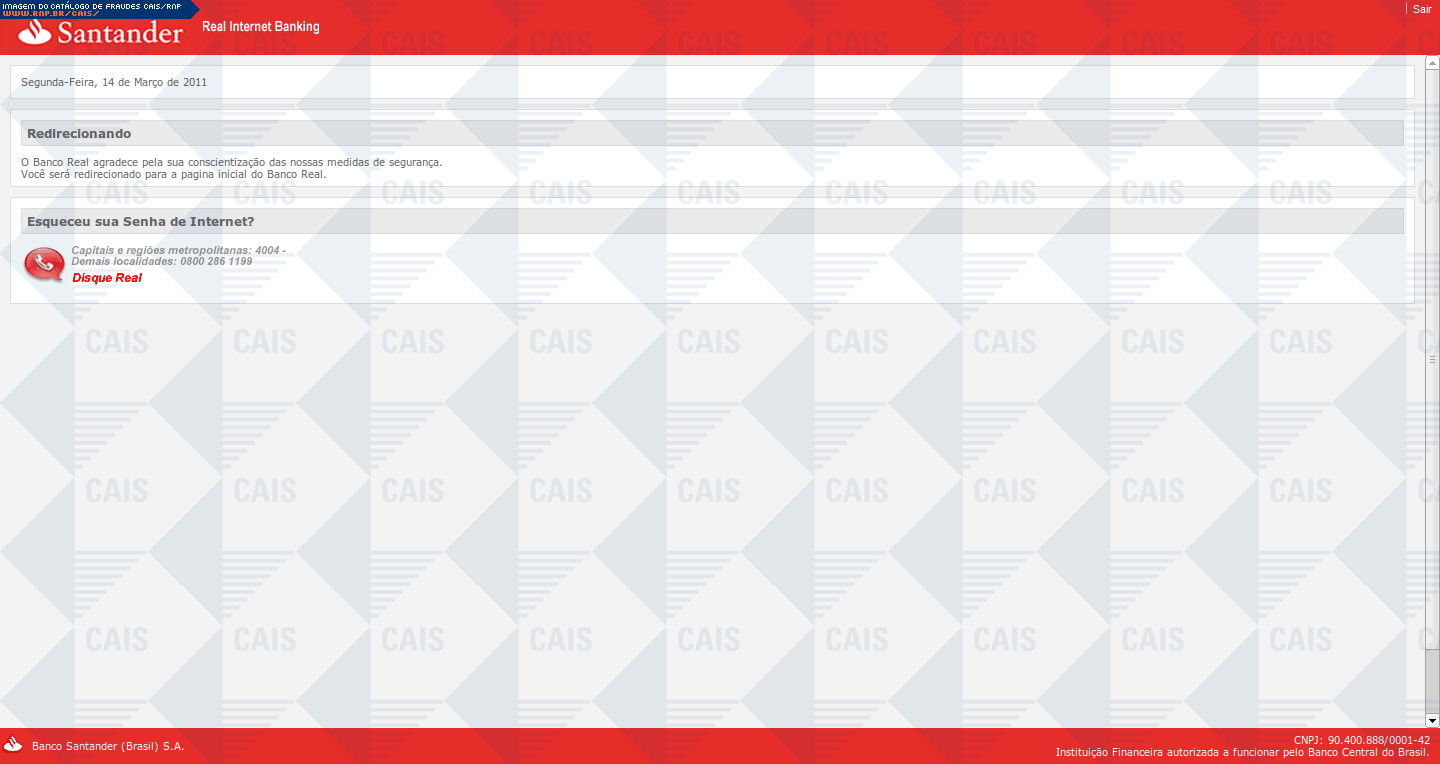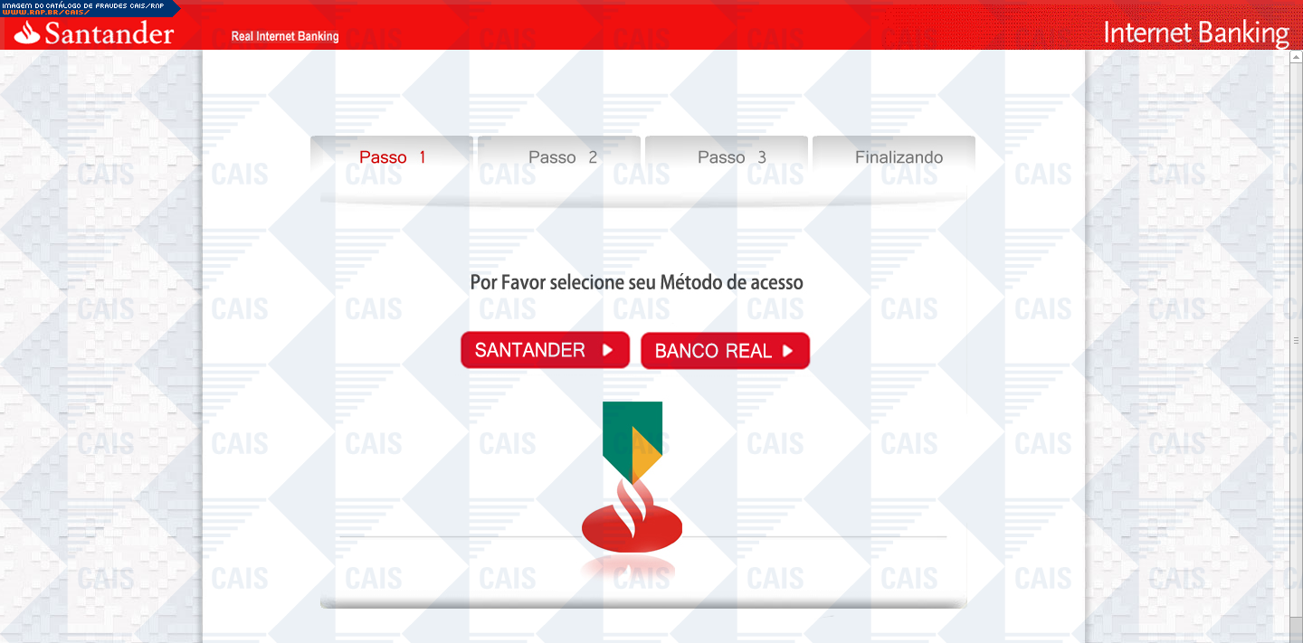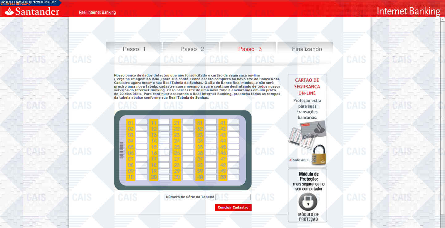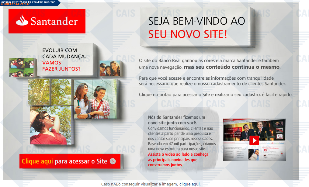 | comentário | Mensagem falsa em nome do Grupo Santander informando que o site do banco Real mudou e, por isso, os clientes devem realizar o cadastro para usar o novo site. O link para o suposto cadastro leva a uma página falsa destinada a coletar dados da conta bancária... (leia mais) | |