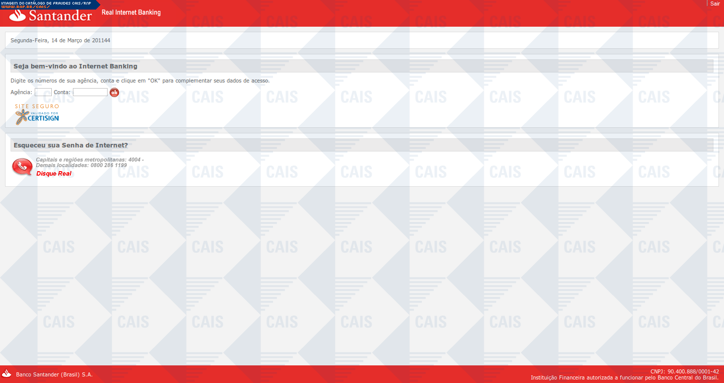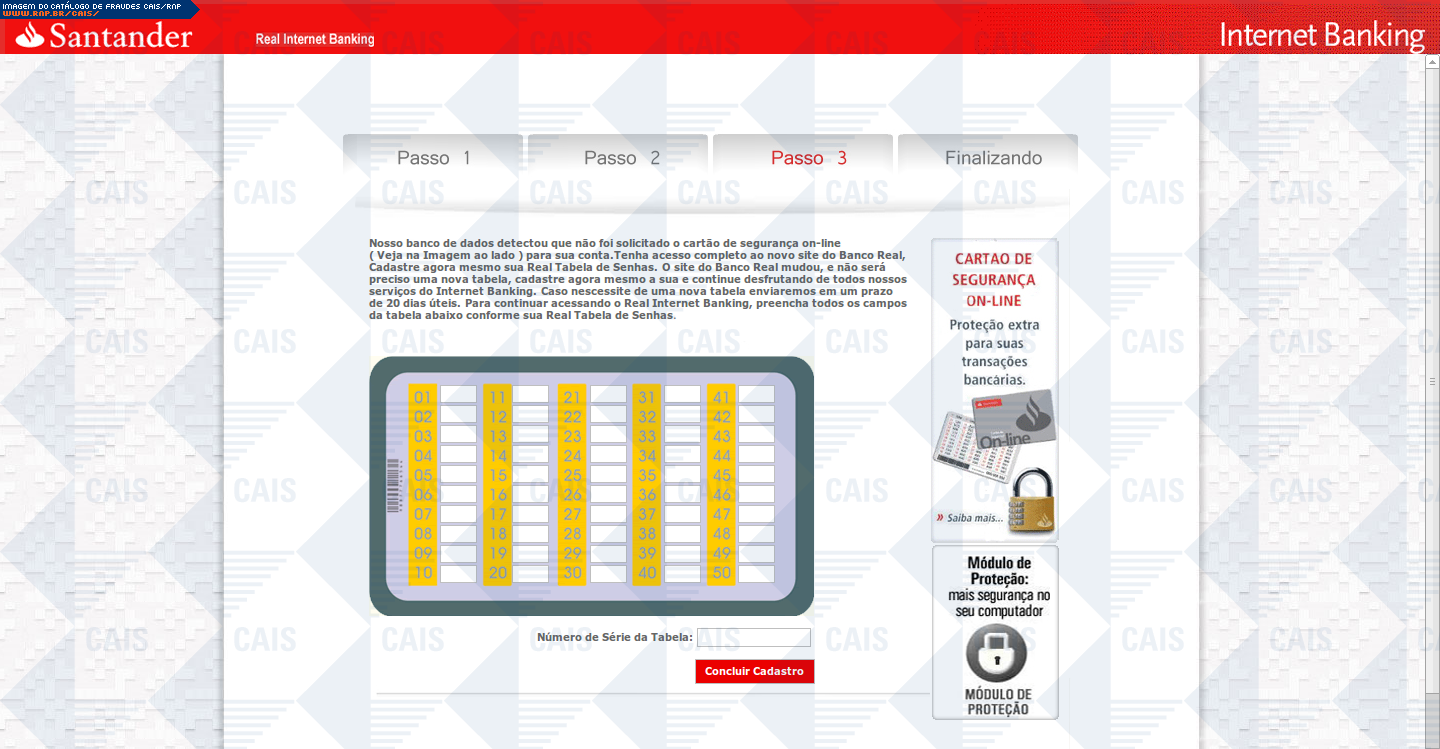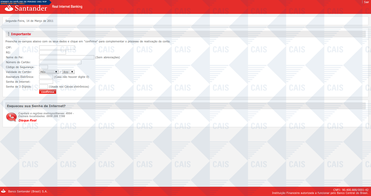 | comentário | Mensagem falsa em nome do Grupo Santander informando que o site do banco Real mudou e, por isso, os clientes devem realizar o cadastro para usar o novo site. O link para o suposto cadastro leva a uma página falsa destinada a coletar dados da conta bancária... (leia mais) | |