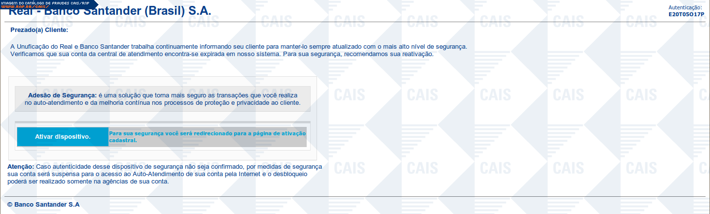 | comentário | Comunicado em nome do banco Real informando que, após a unificação com o Banco Santander, foi verificado que o dispositivo de segurança da vítima está desativado. A fraude alicia a vítima a realizar uma suposta adesão de segurança através de um link contido... (leia mais) | |
