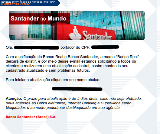 | comentário | Comunicado falso do Grupo Santander solicitando que a vítima efetue uma suposta atualização cadastral. A mensagem contém o nome e o cpf da vítima. O link contido na mensagem leva a uma página falsa destinada a coletar dados confidenciais da vítima. | |