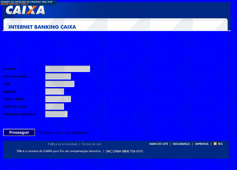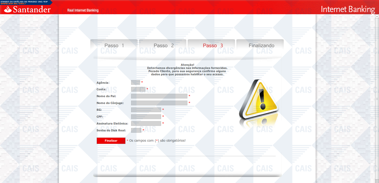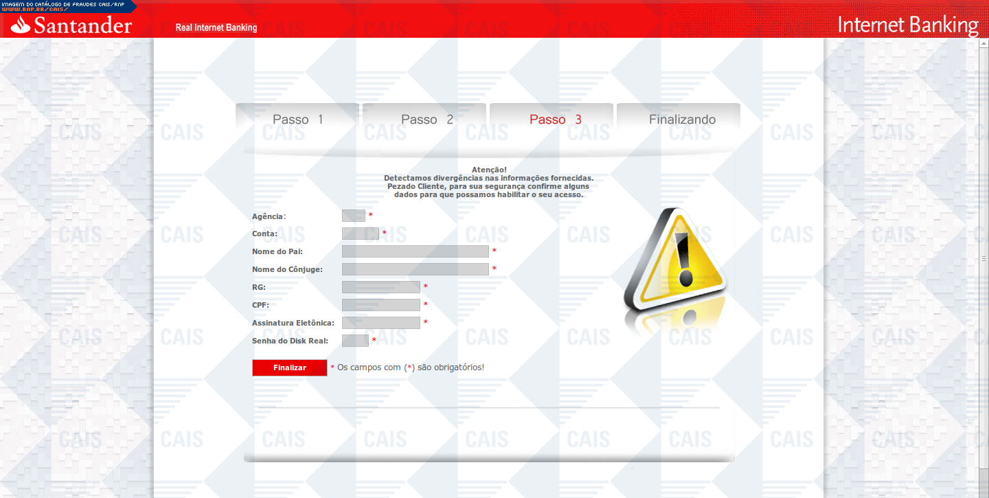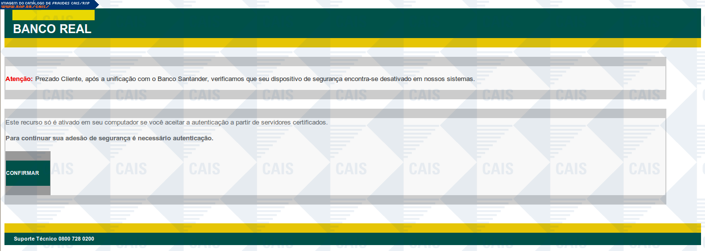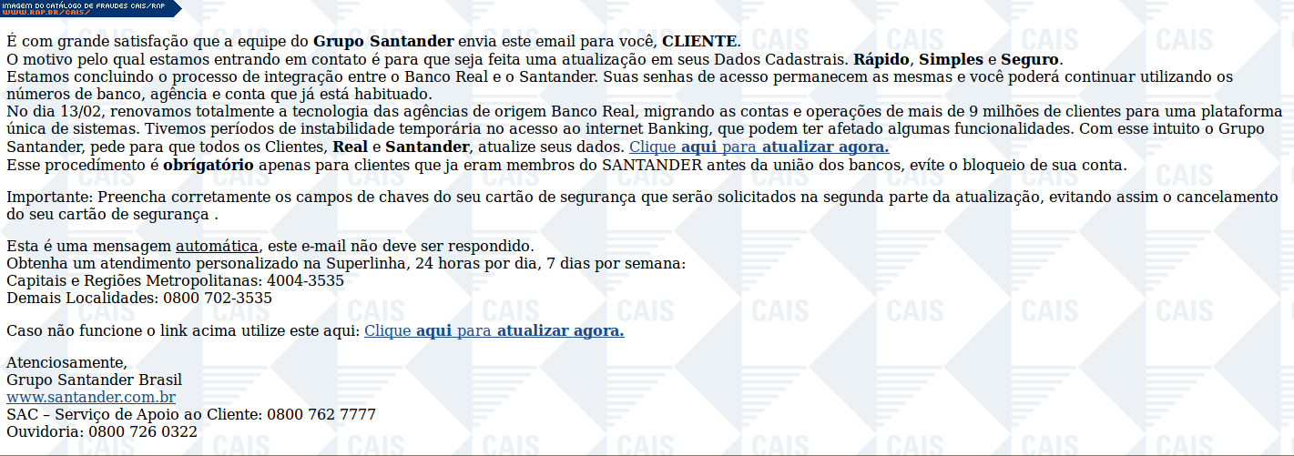 Esta página tem função informativa e educativa. Exibe uma coleção de imagens de phishing scam (fraudes eletrônicas) ou malware (código malicioso) veiculados por meio de spam (e-mail não-solicitado). Trata-se de conteúdo exemplificativo, não exaustivo, uma vez que não é possível contemplar todos os casos de fraudes existentes. Assim, caso você tenha conhecimento de um exemplar que não esteja aqui presente, isto não significa que não seja válido ou real. Inclusive incentivamos que você o envie para análise do CAIS para que, se for o caso, passe a integrar o nosso acervo.