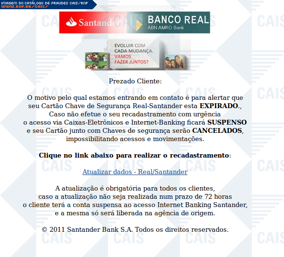 | comentário | Mensagem falsa em nome dos bancos Real e Santander informando que o cartão chave de segurança da vítima está expirado. A mensagem fornece um link para que a vítima atualize seus dados. O link leva a conteúdo malicioso que não estava disponível no momento... (leia mais) | |