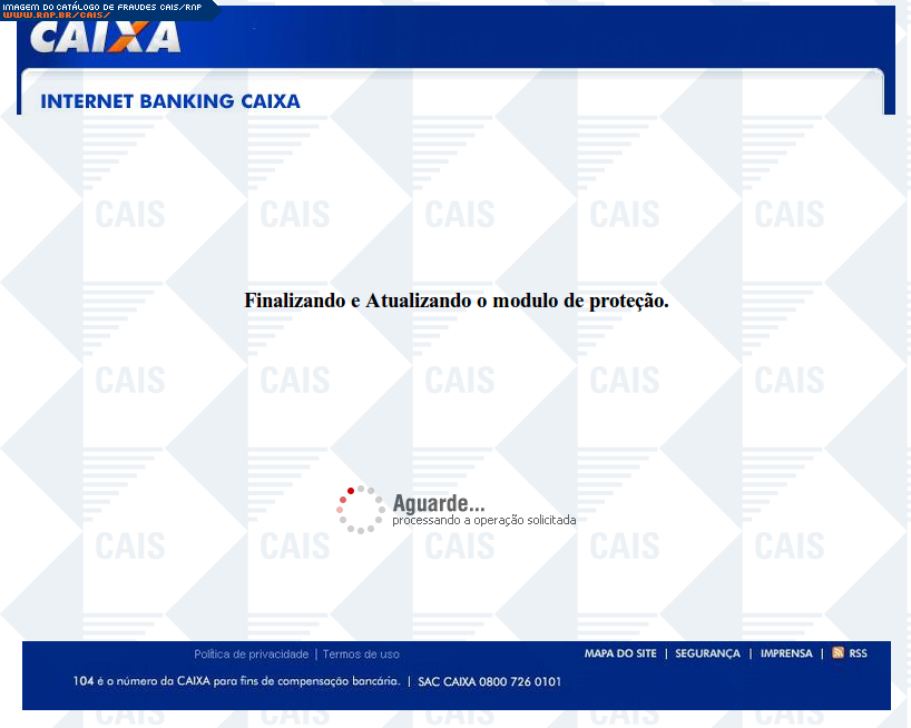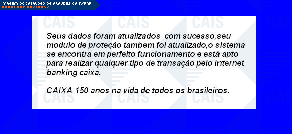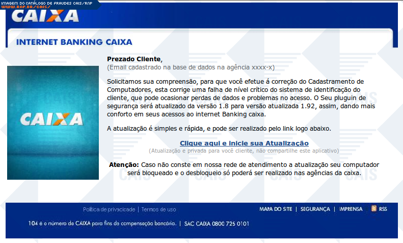 | comentário | Mensagem em nome da Caixa Econômica Federal solicitando que a vítima realize uma suposta correção ao cadastramento de computadore através da atualização de um plug in. O link contido na fraude leva a um site falso destinado a roubar dados confidenciais da... (leia mais) | |