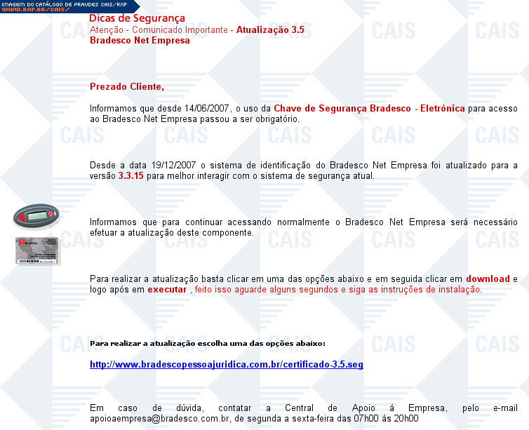| comentário | Mensagem que se passa por um comunicado do banco Bradesco. A mensagem informa o usuário sobre a necessidade de atualização do Bradesco Net Empresa para a versão 3.3.15. O link para o software malicioso não estava mais disponível no momento da análise. Maiores... (leia mais) | |