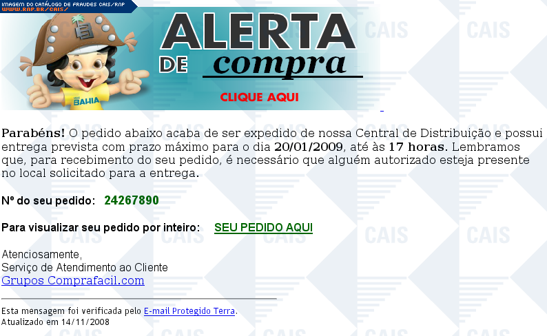 Esta página tem função informativa e educativa. Exibe uma coleção de imagens de phishing scam (fraudes eletrônicas) ou malware (código malicioso) veiculados por meio de spam (e-mail não-solicitado). Trata-se de conteúdo exemplificativo, não exaustivo, uma vez que não é possível contemplar todos os casos de fraudes existentes. Assim, caso você tenha conhecimento de um exemplar que não esteja aqui presente, isto não significa que não seja válido ou real. Inclusive incentivamos que você o envie para análise do CAIS para que, se for o caso, passe a integrar o nosso acervo.
