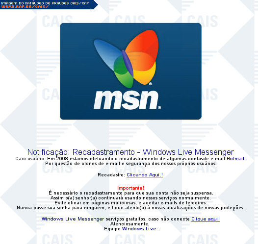 | comentário | Mensagem que se passa por uma notificação do serviço Windows Live Messenger, avisando que a conta do usuário pode ser suspensa caso não efetue o recadastramento da conta. O link para o recadastramento contém o software malicioso W32/Bancos.ADYI (Norman). | |