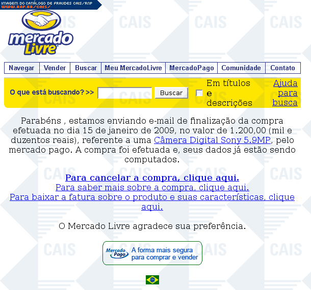 | comentário | Fraude que utiliza o nome do site de leilões MercadoLivre informando sobre a compra de uma camera digital em 15 de Janeiro de 2009. O link para o software malicioso não estava mais disponível no momento da análise. | |
