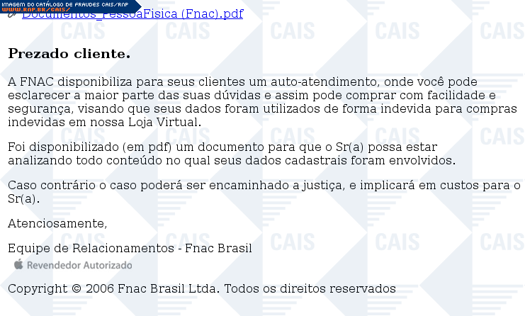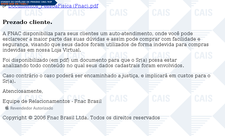 | comentário | Mensagem que tenta se passar por um comunicado da Loja Virtual FNAC. O usuário é informado que seus dados foram utilizados em uma compra de maneira indevida, e é instruído a abrir um documento em PDF. O falso documento guarda o software malicioso TROJ_DLOADR.RK... (leia mais) | |