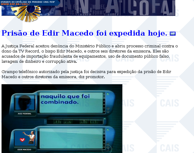 | comentário | Mensagem se passando por notícia da globo.com sobre suposta prisão de Edir Macedo. O link para o vídeo da notícia leva a um software malicioso identificado como Trojan-Downloader:W32/Banker.IAL (F-Secure) | |