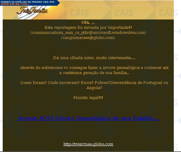 | comentário | A mensagem possui um link que possibilitaria ao leitor conhecer a árvore genealógica de sua família. O link leva a um software malicioso, identificado como TR/Crypt.CFI.Gen (AntiVir). | |