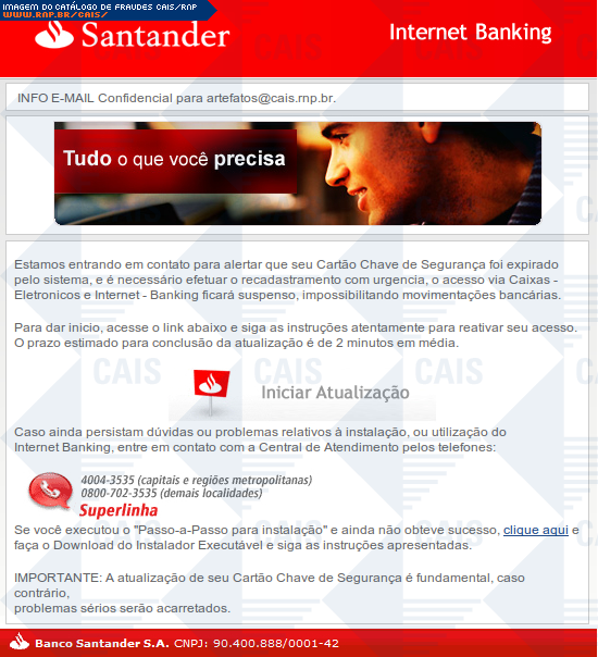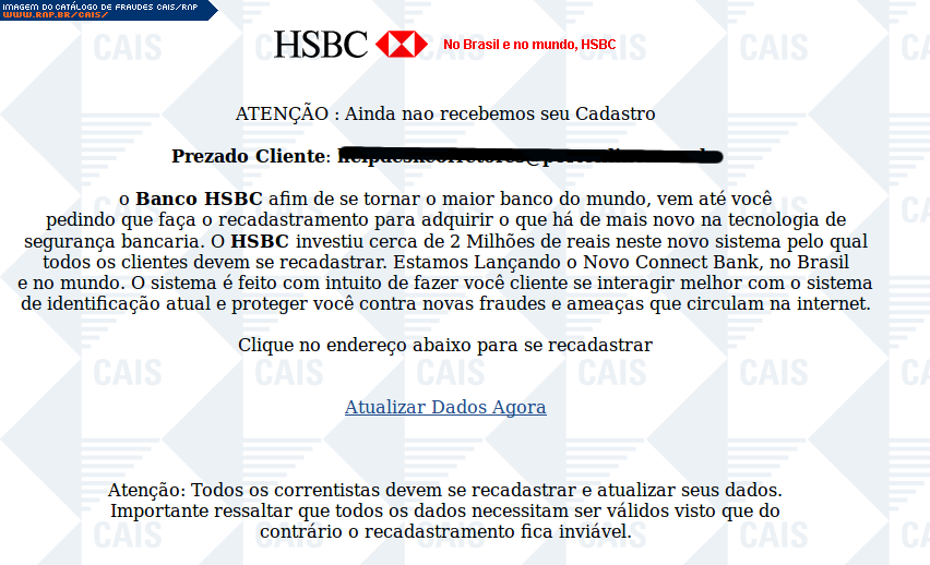 Esta página tem função informativa e educativa. Exibe uma coleção de imagens de phishing scam (fraudes eletrônicas) ou malware (código malicioso) veiculados por meio de spam (e-mail não-solicitado). Trata-se de conteúdo exemplificativo, não exaustivo, uma vez que não é possível contemplar todos os casos de fraudes existentes. Assim, caso você tenha conhecimento de um exemplar que não esteja aqui presente, isto não significa que não seja válido ou real. Inclusive incentivamos que você o envie para análise do CAIS para que, se for o caso, passe a integrar o nosso acervo.
