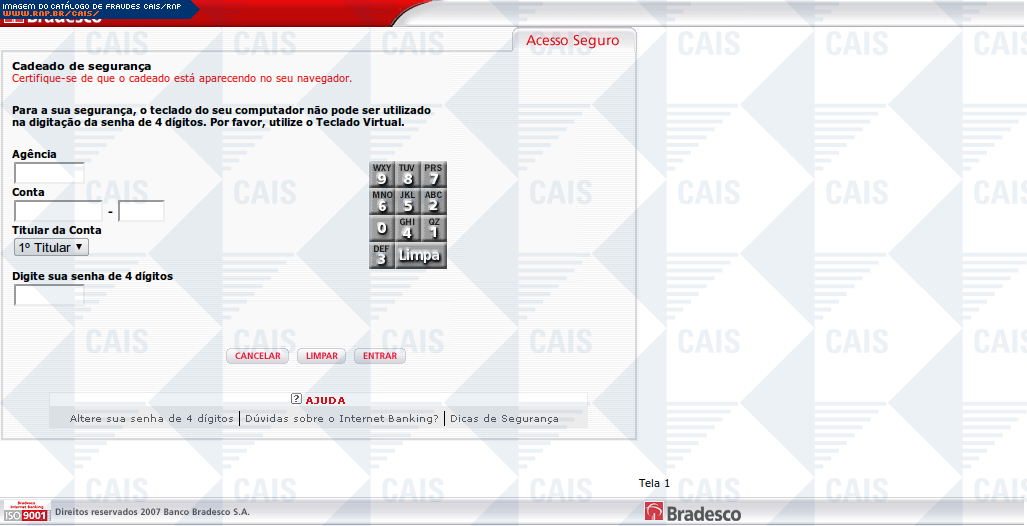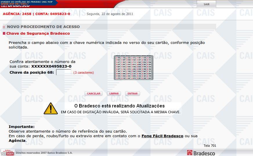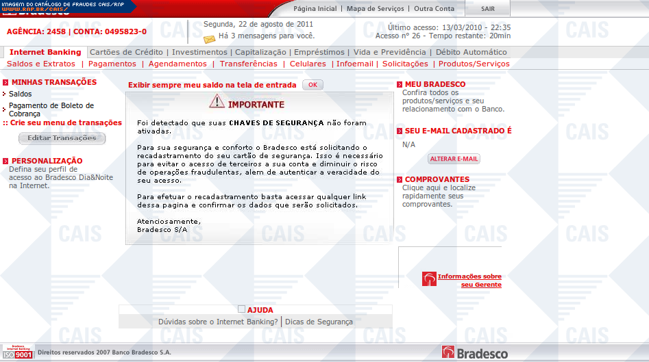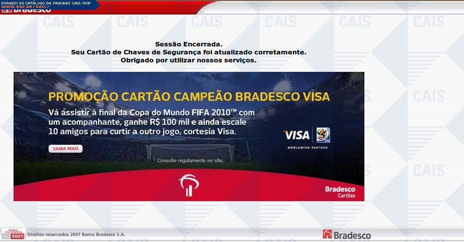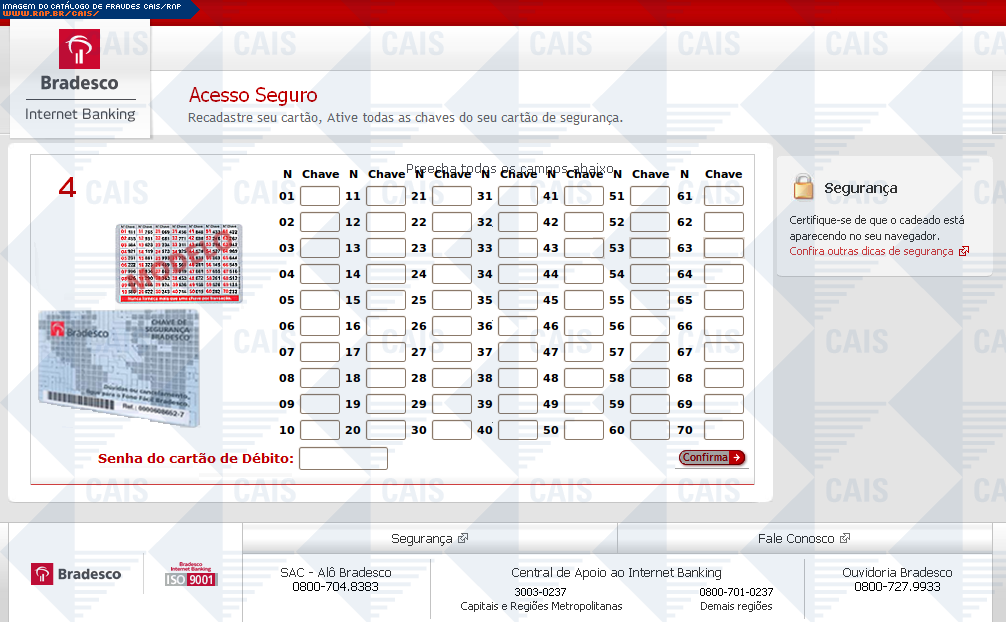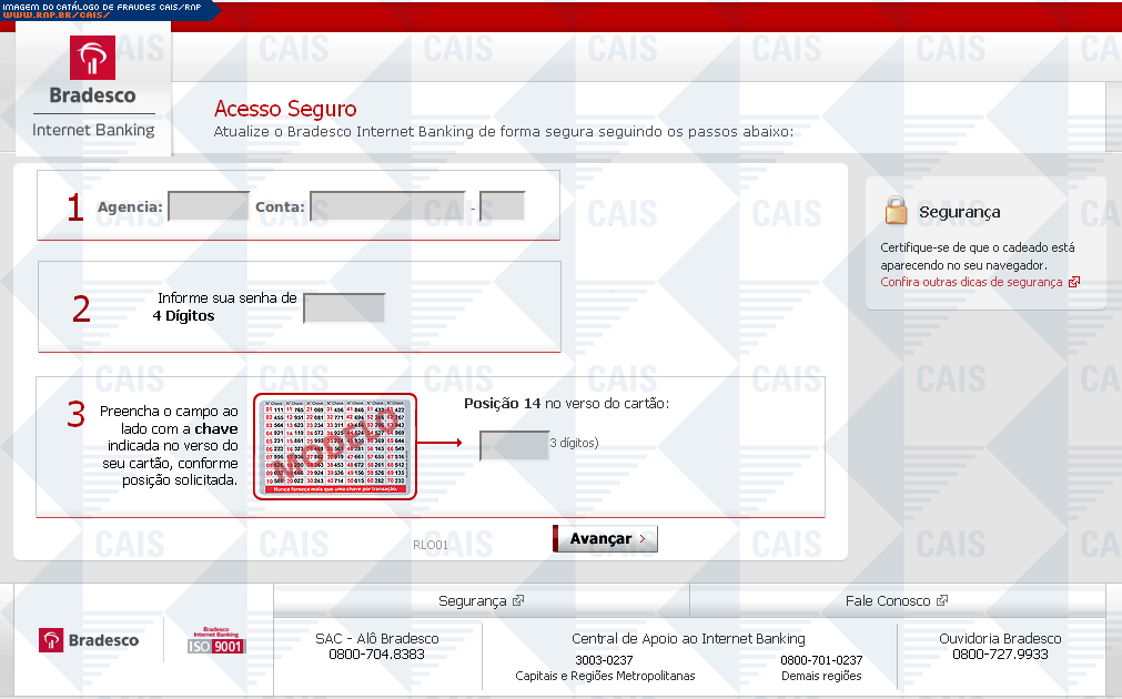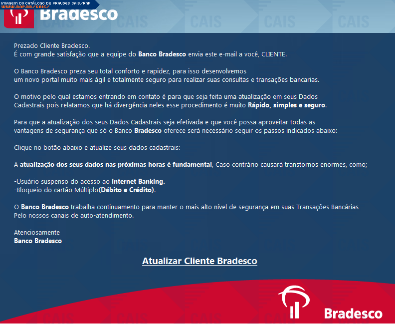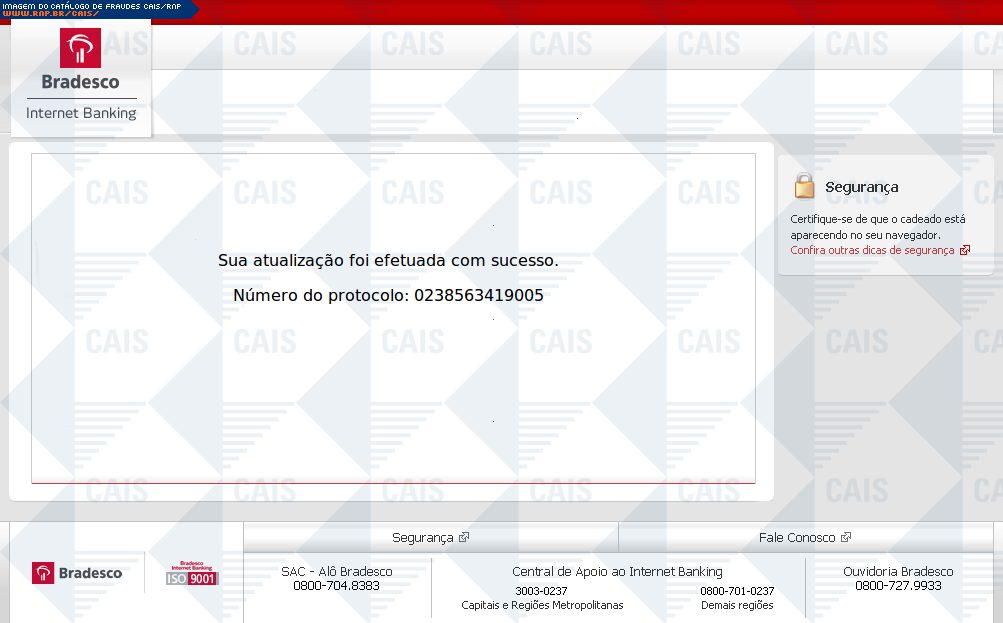 | comentário | A fraude oferece um link para Atualização de Dados do banco Bradesco. Ao entrar no link, o mesmo direciona para uma página que faz a coleta de dados como: Agencia, Conta, Senha e chave do cartão de segurança. Após avançar, aparece outra página solicitando... (leia mais) | |