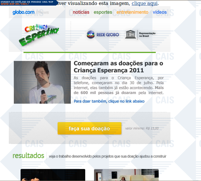 | comentário | A mensagem, em nome do site globo.com, contém um link para doações para o Criança Esperança 2011. O link leva a conteúdo malicioso que já havia sido removido no momento da análise. | |