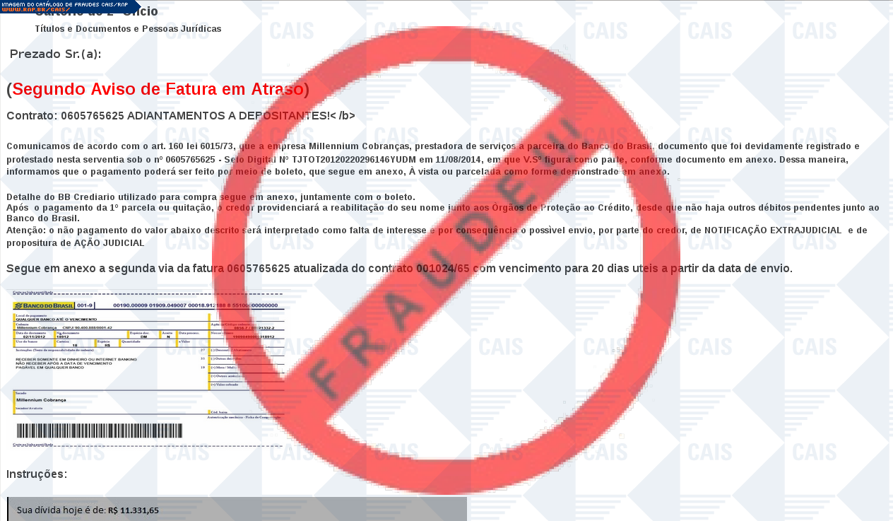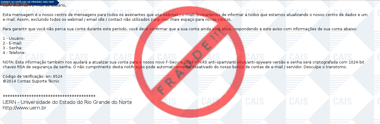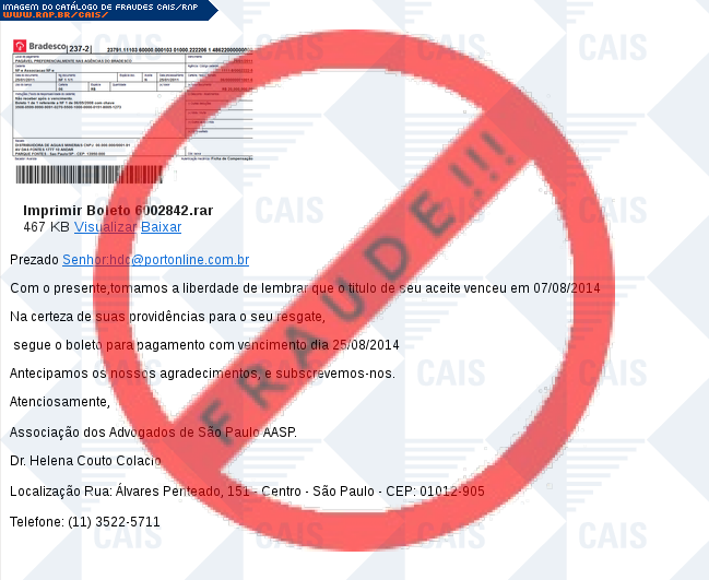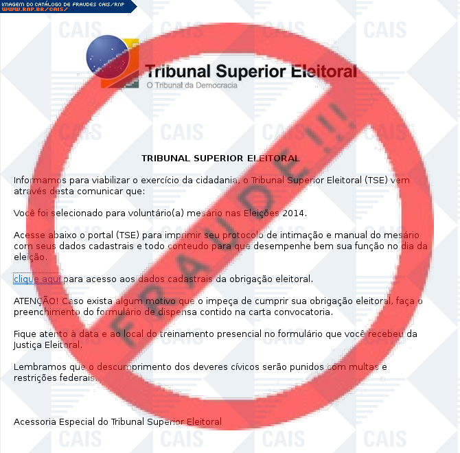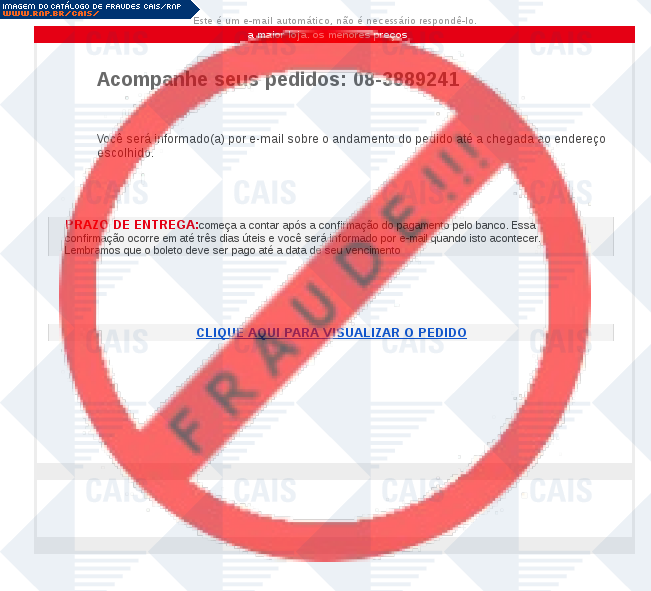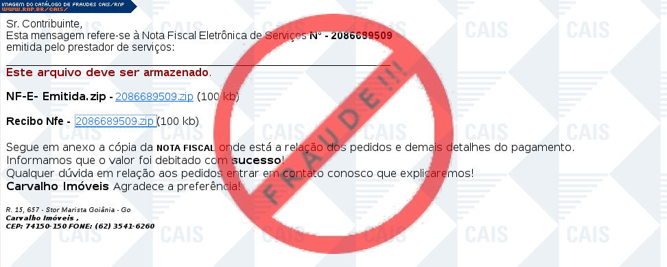 Esta página tem função informativa e educativa. Exibe uma coleção de imagens de phishing scam (fraudes eletrônicas) ou malware (código malicioso) veiculados por meio de spam (e-mail não-solicitado). Trata-se de conteúdo exemplificativo, não exaustivo, uma vez que não é possível contemplar todos os casos de fraudes existentes. Assim, caso você tenha conhecimento de um exemplar que não esteja aqui presente, isto não significa que não seja válido ou real. Inclusive incentivamos que você o envie para análise do CAIS para que, se for o caso, passe a integrar o nosso acervo.