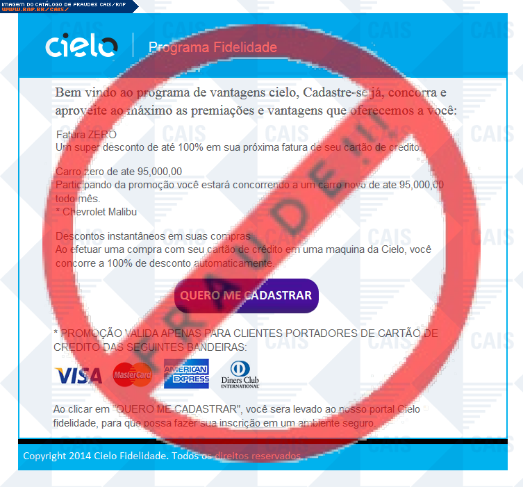 | comentário | A vítima recebe um e-mail informando sobre os benefícios do programa de fidelidade relacionado ao cartão Cielo, disponibilizando o link para cadastro, no entanto a página é falsa criada para roubar as informações do cartão da vítima. | |