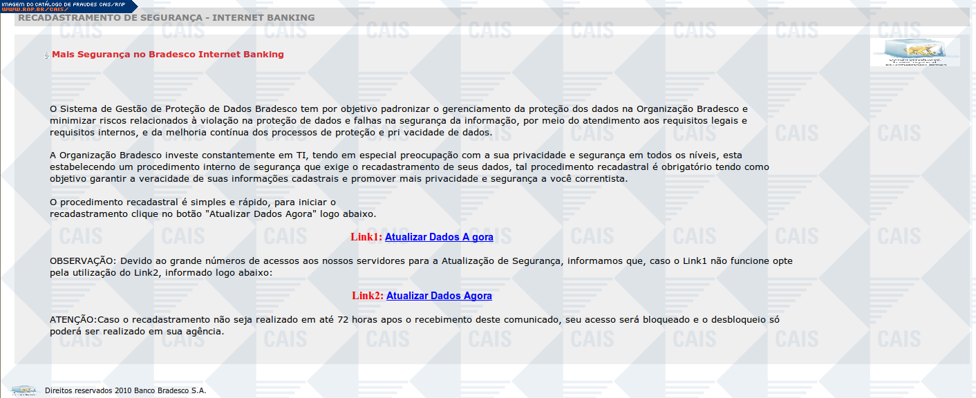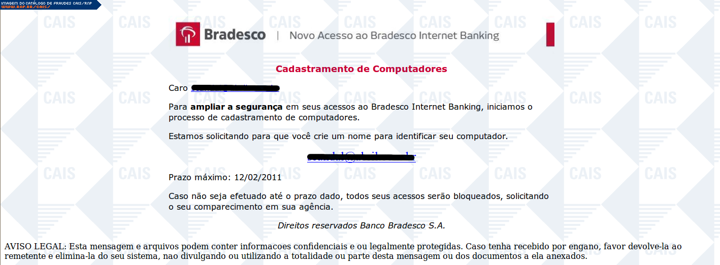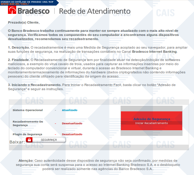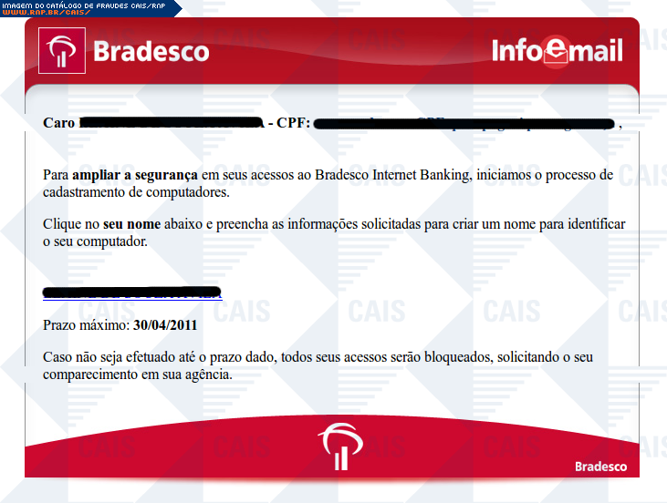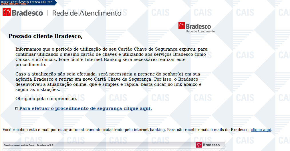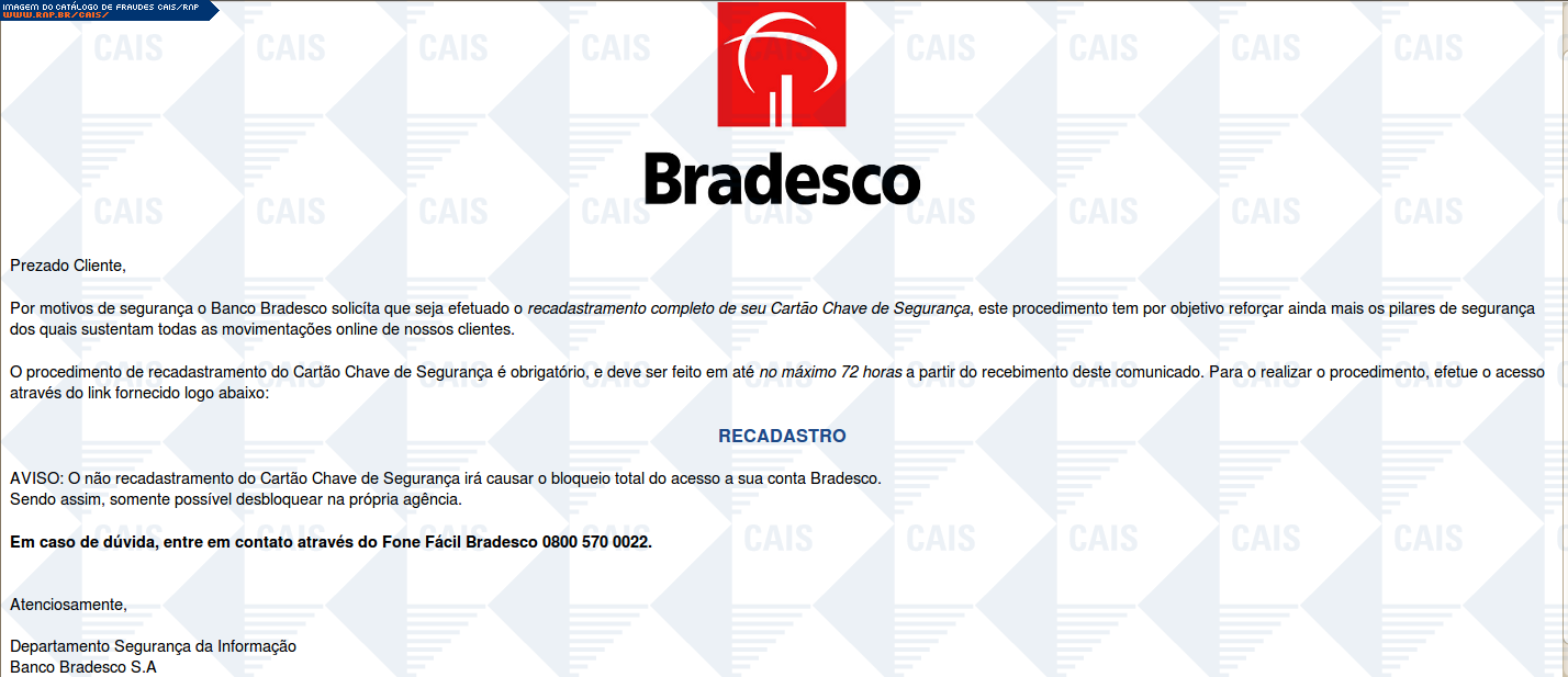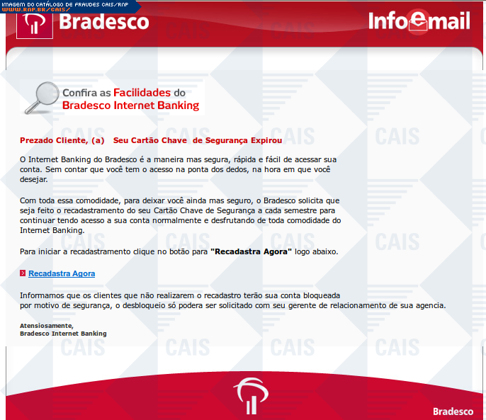 | comentário | A mensagem usa o nome do banco Bradesco para solicitar que a vítima realize um falso recadastramento. A fraude contém um link que leva a um software malicioso que foi identificado como Gen:Tr.Crypt.Dlf.F.GGW@aenq4EgG (BitDefender). | |