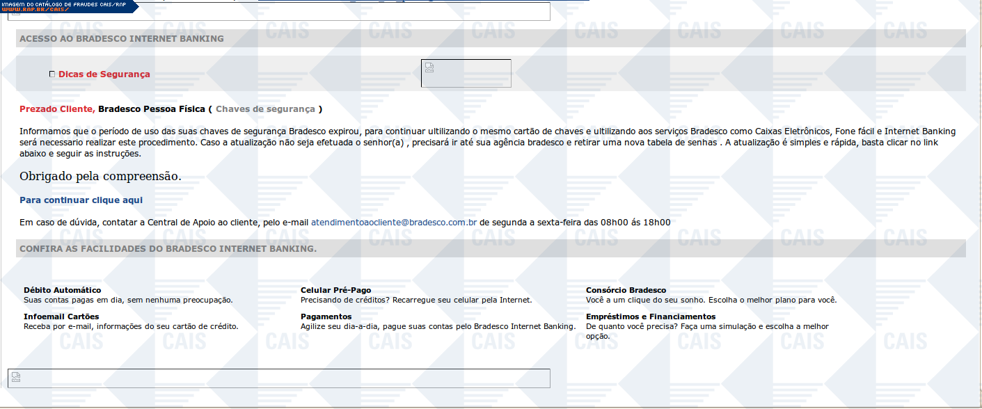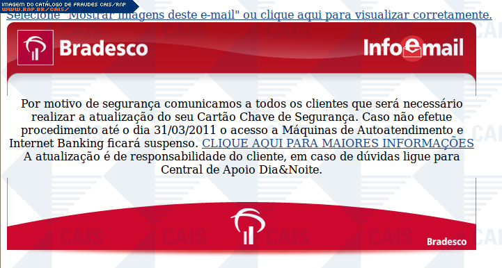 | comentário | A mensagem se passa por um comunicado do banco Bradesco que informa que a vítima deve atualizar se cartão de chaves de segurança. A fraude contém um link que leva a uma página falsa, destinada a roubar dados da conta bancária da vítima. | |