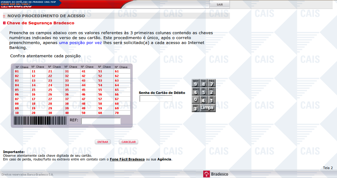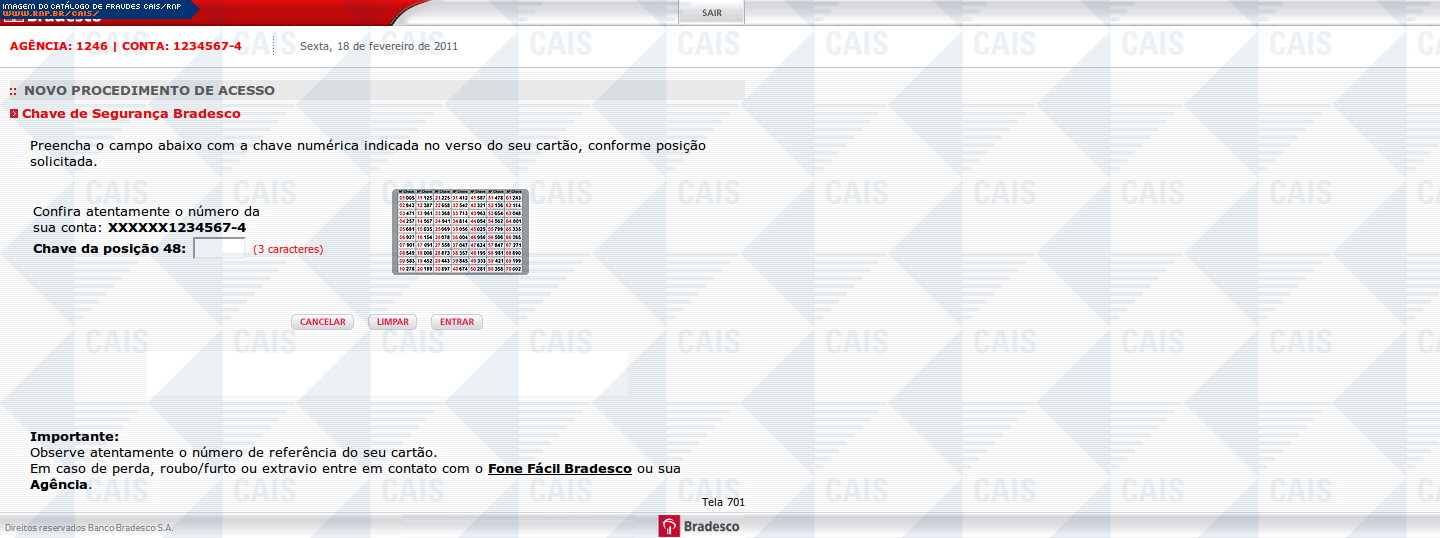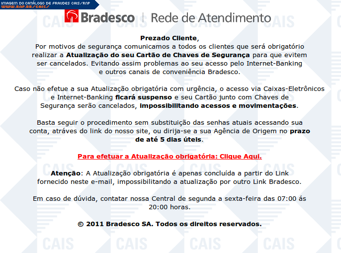 | comentário | Comunicado falso em nome do banco Bradesco informando que todos os clientes devem realizar a atualização do Cartão Chave de Segurança. De acordo com a mensagem caso o procedimento não seja realizado até o dia 31/03/2011 o acesso às Máquinas de Auto-atendimento... (leia mais) | |