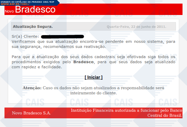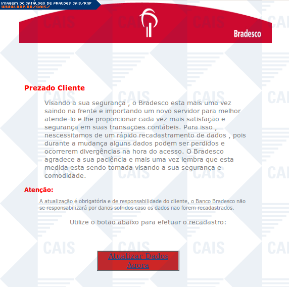 | comentário | Comunicado falso em nome do banco Bradesco solicitando que a vítima efetue a correção dos dados de sua conta. A mensagem contém um link para a suposta atualizão que leva a uma página falsa destinada a roubar dados confidenciais da vítima. | |