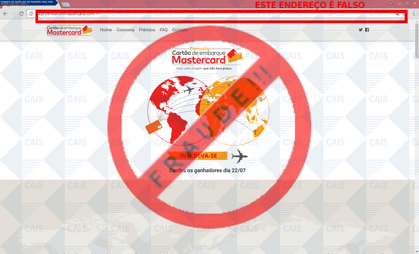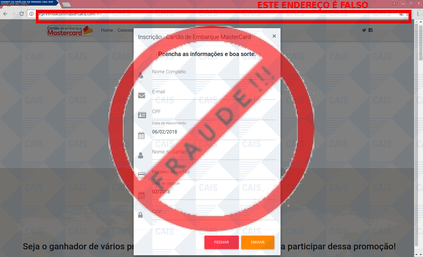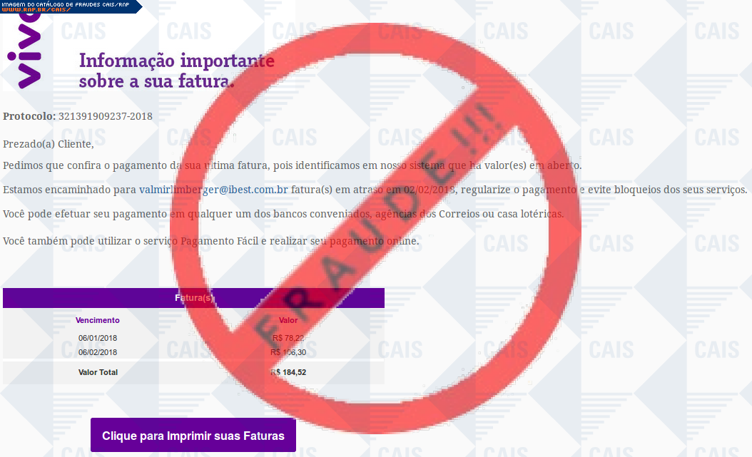 Esta página tem função informativa e educativa. Exibe uma coleção de imagens de phishing scam (fraudes eletrônicas) ou malware (código malicioso) veiculados por meio de spam (e-mail não-solicitado). Trata-se de conteúdo exemplificativo, não exaustivo, uma vez que não é possível contemplar todos os casos de fraudes existentes. Assim, caso você tenha conhecimento de um exemplar que não esteja aqui presente, isto não significa que não seja válido ou real. Inclusive incentivamos que você o envie para análise do CAIS para que, se for o caso, passe a integrar o nosso acervo.