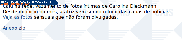 | comentário | A fraude contém um link para supostas fotos íntimas de Carolina Dieckmann. O link leva ao download de um arquivo malicioso que foi identificado como Trojan-Banker.Win32.Bancos(Ikarus). | |