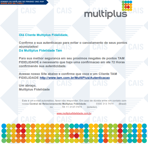 | comentário | A fraude contém um link para que a vítima confirme sua autenticação para evitar o cancelamento de seus pontos acumulados. O conteúdo malicioso já havia sido removido no momento da análise. | |