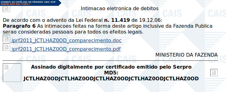 | comentário | A frade tenta se passar por uma intimação eletrônica de débitos, em nome do Ministério da Fazenda. O conteúdo malicioso não estava disponível no momento da análise. | |