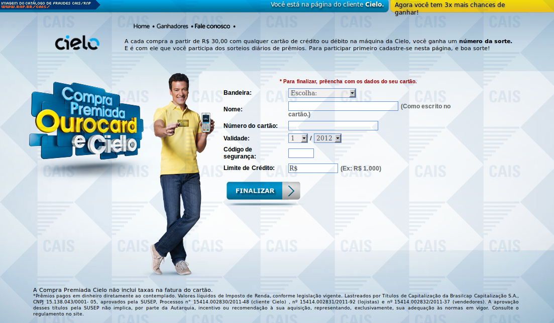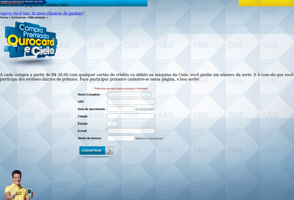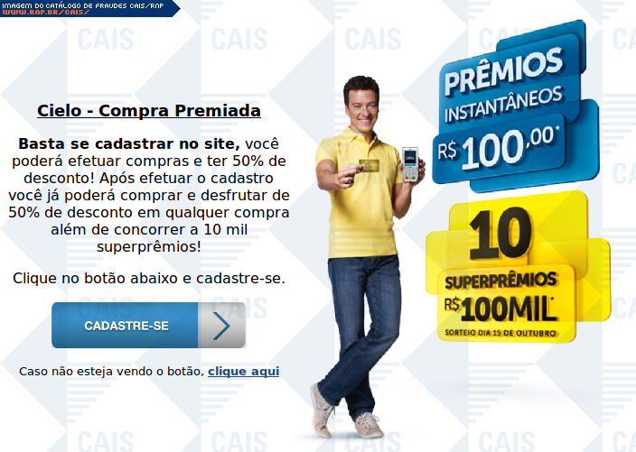 | comentário | Falsa mensagem em nome da Cileo oferece participação em promoção. O link destinado ao cadastro, contudo, leva à uma falsa página da Cielo, na qual dados confidenciais são solicitados. | |