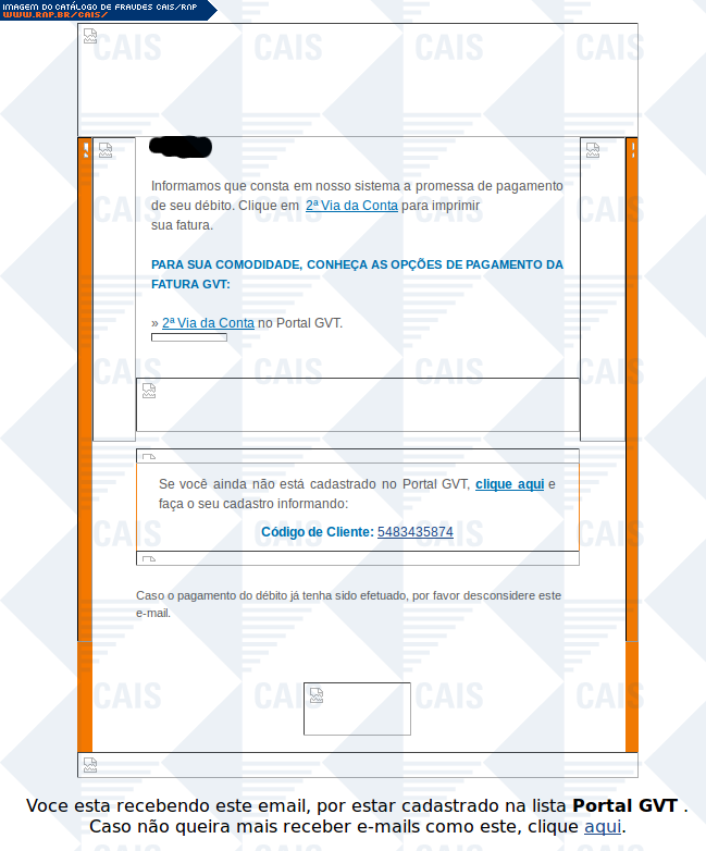 | comentário | Mensagem em nome da GVT informa acerca da existência de uma fatura em aberto. Havia um link para download de segunda via, contudo nenhum arquivo estava disponível no momento da análise. | |