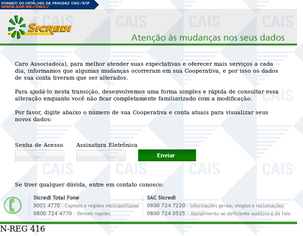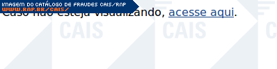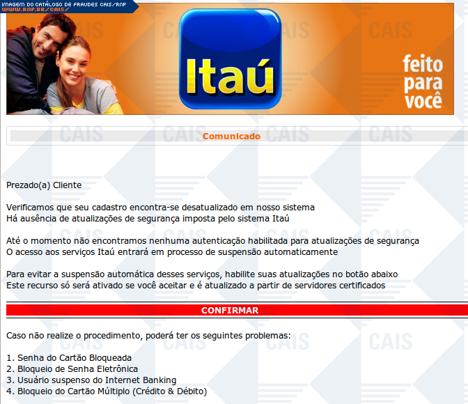 Esta página tem função informativa e educativa. Exibe uma coleção de imagens de phishing scam (fraudes eletrônicas) ou malware (código malicioso) veiculados por meio de spam (e-mail não-solicitado). Trata-se de conteúdo exemplificativo, não exaustivo, uma vez que não é possível contemplar todos os casos de fraudes existentes. Assim, caso você tenha conhecimento de um exemplar que não esteja aqui presente, isto não significa que não seja válido ou real. Inclusive incentivamos que você o envie para análise do CAIS para que, se for o caso, passe a integrar o nosso acervo.