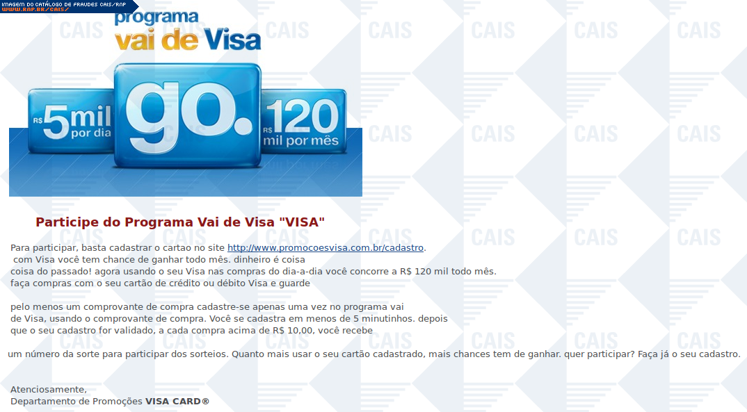 | comentário | Falsa mensagem em nome de Visa oferece cadastro em suposta promoção. O link para cadastro, cuntudo, não apontava para um endereço válido no momento da análise. | |