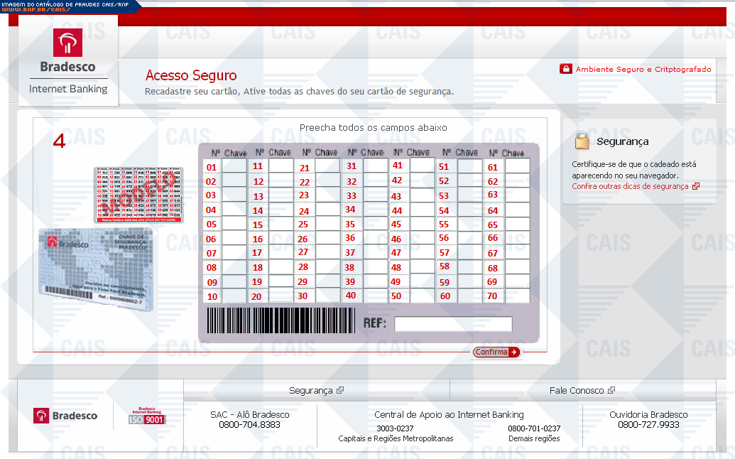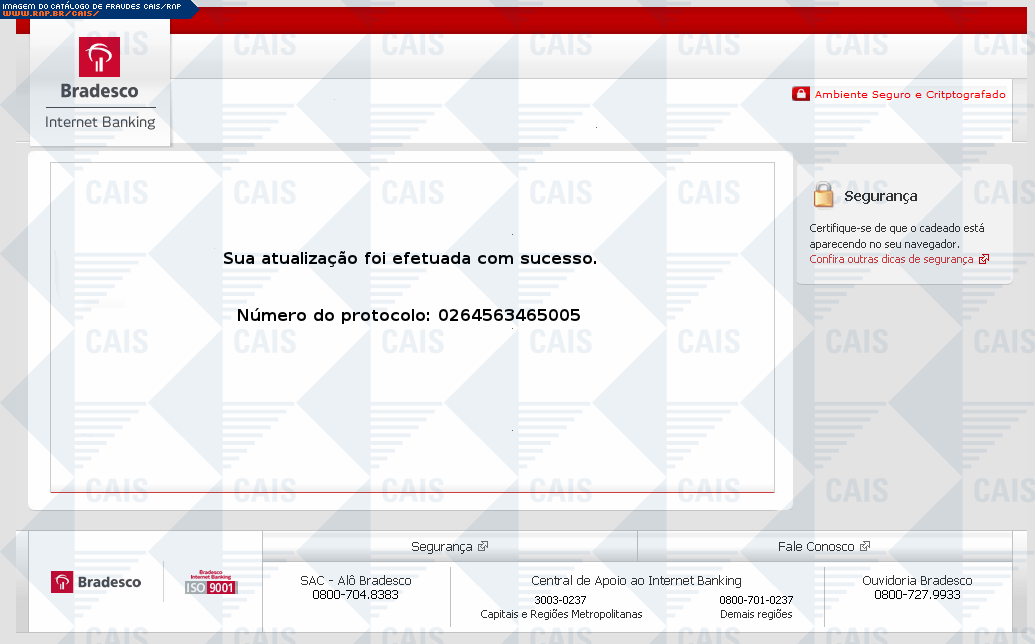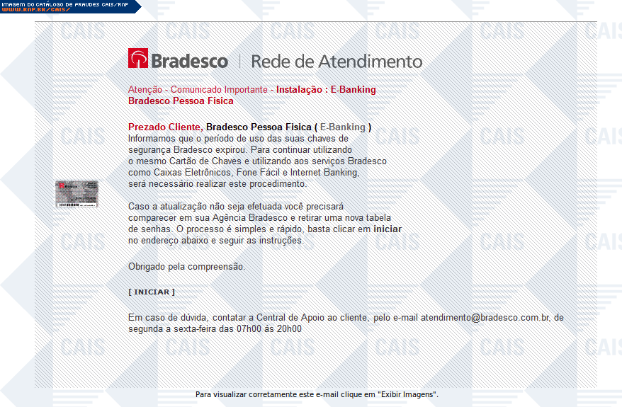 | comentário | Falsa mensagem em nome do Banco Bradesco informa à vítima de que suas chaves de segurança estão expiradas. Havia um link para atualização de tais chaves, contudo, este levava à uma falsa página do banco, na qual dados confidenciais foram solicitados. | |