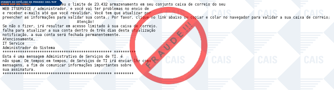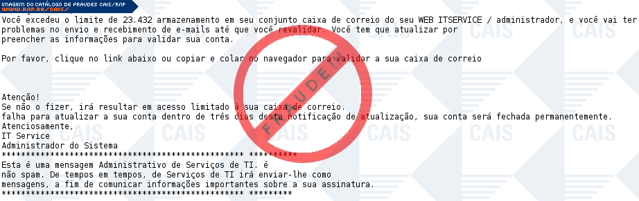 | comentário | Uma mensagem é enviada informando que a cota de e-mail do usuário foi excedida e que precisa atualizar as informações da sua conta através do link disponibilizado, mas trata-se de um tentativa de phishing. | |