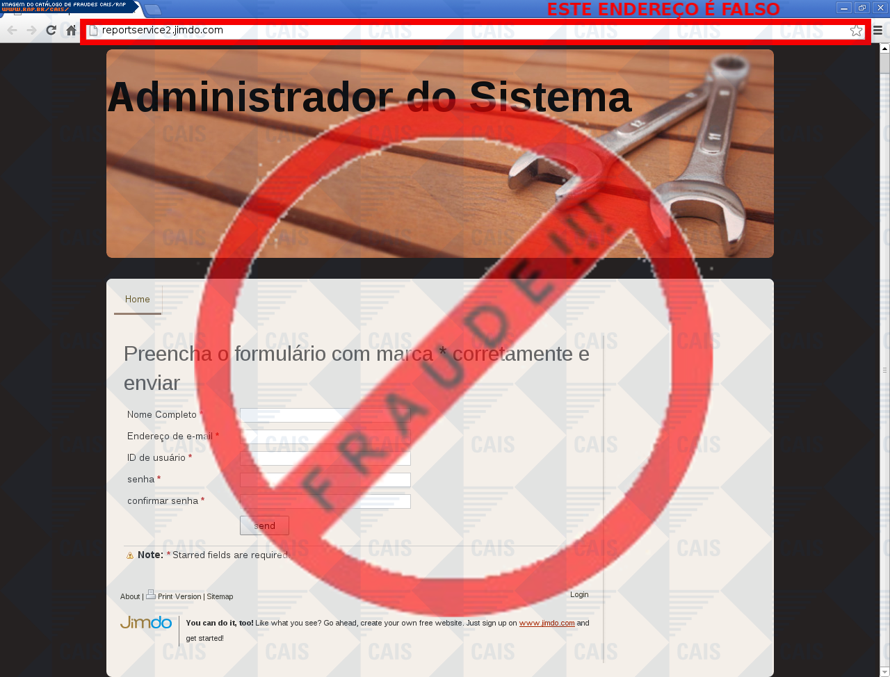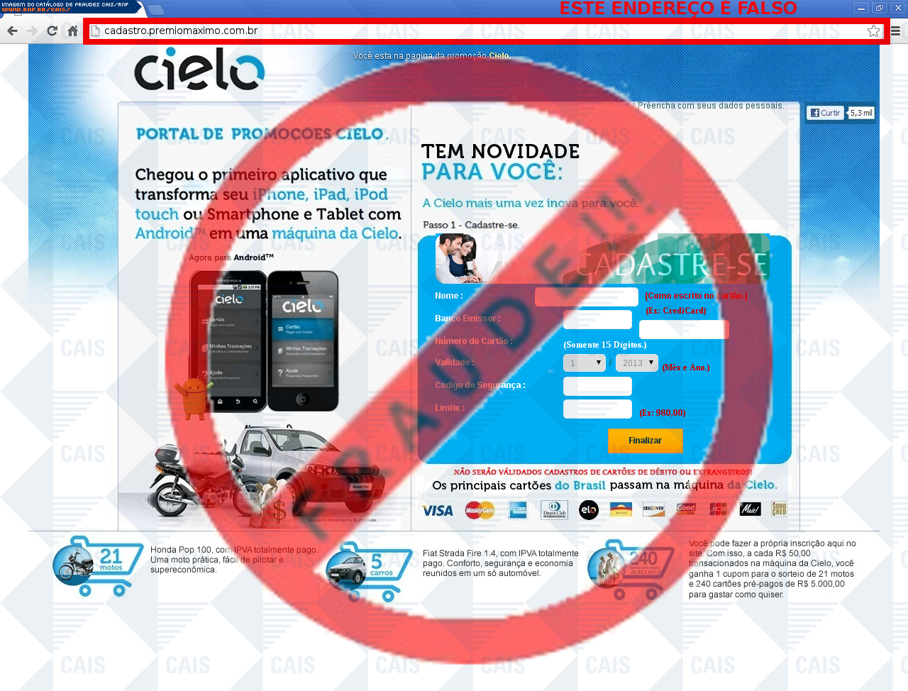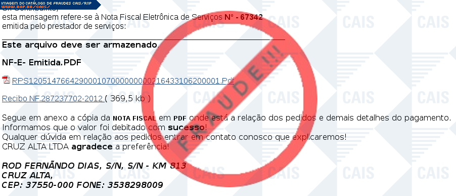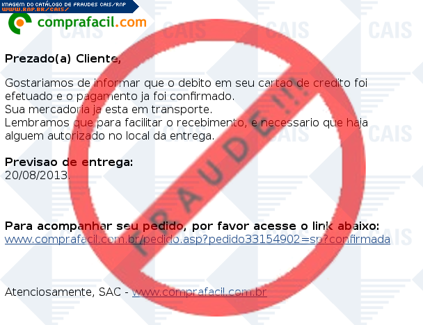 Esta página tem função informativa e educativa. Exibe uma coleção de imagens de phishing scam (fraudes eletrônicas) ou malware (código malicioso) veiculados por meio de spam (e-mail não-solicitado). Trata-se de conteúdo exemplificativo, não exaustivo, uma vez que não é possível contemplar todos os casos de fraudes existentes. Assim, caso você tenha conhecimento de um exemplar que não esteja aqui presente, isto não significa que não seja válido ou real. Inclusive incentivamos que você o envie para análise do CAIS para que, se for o caso, passe a integrar o nosso acervo.