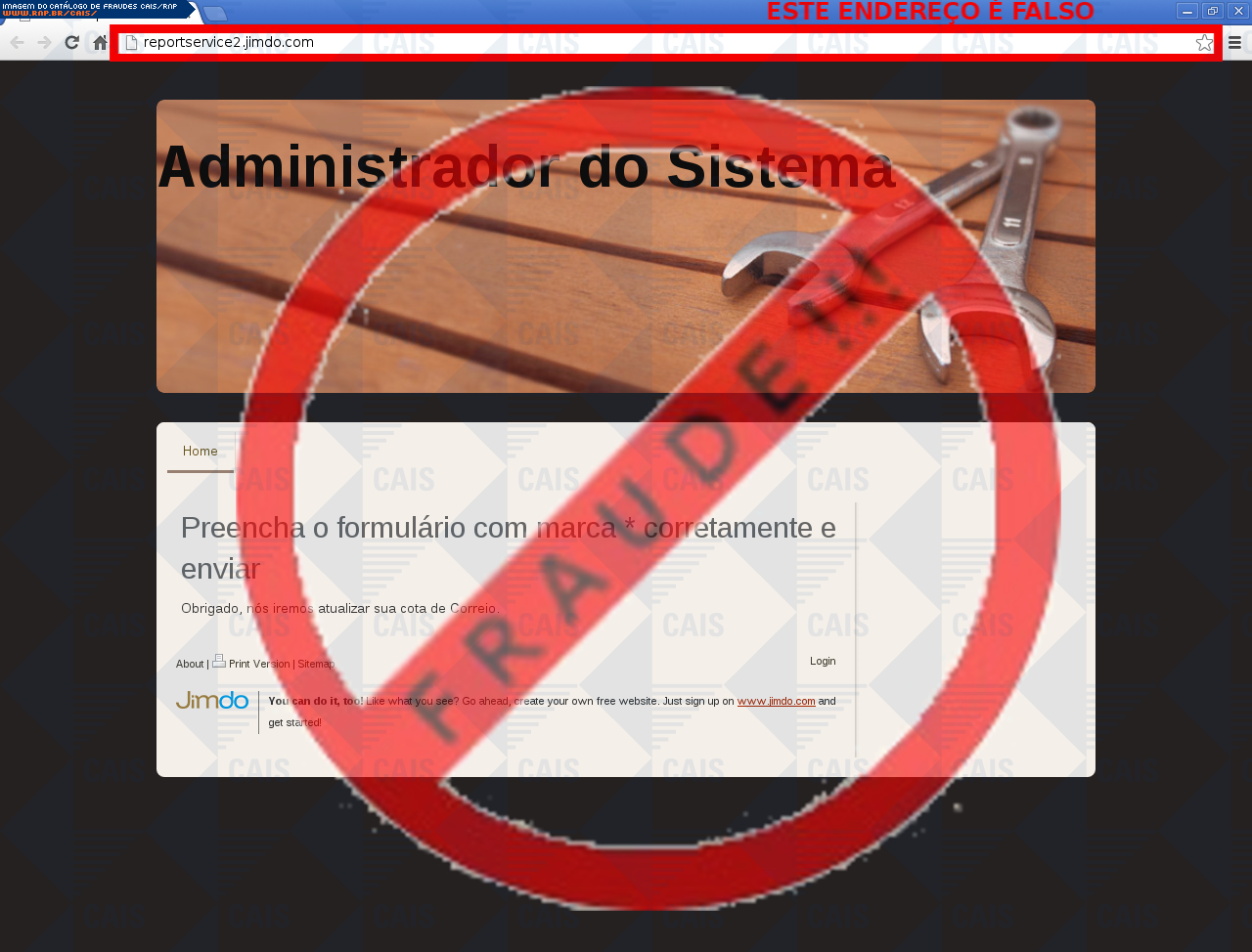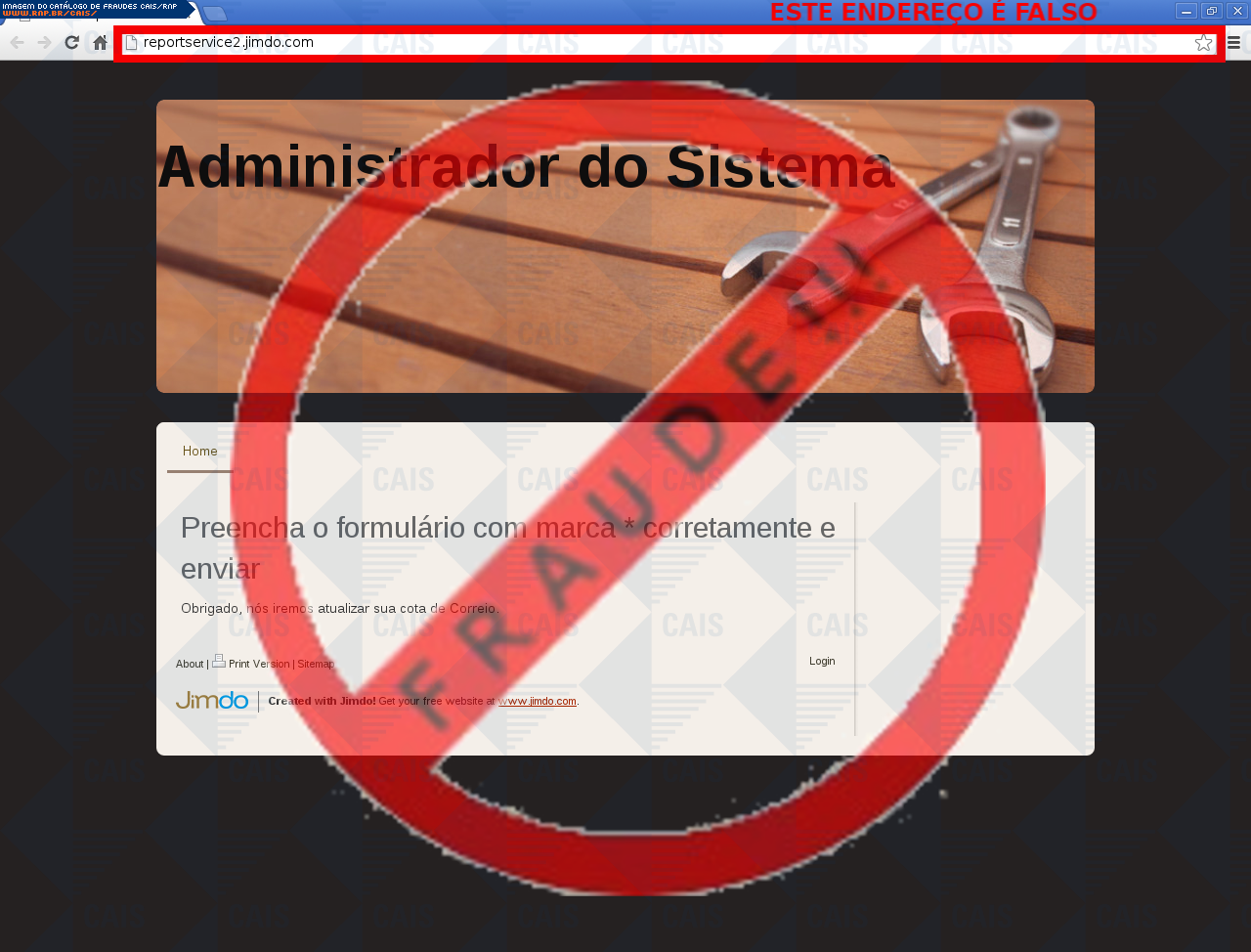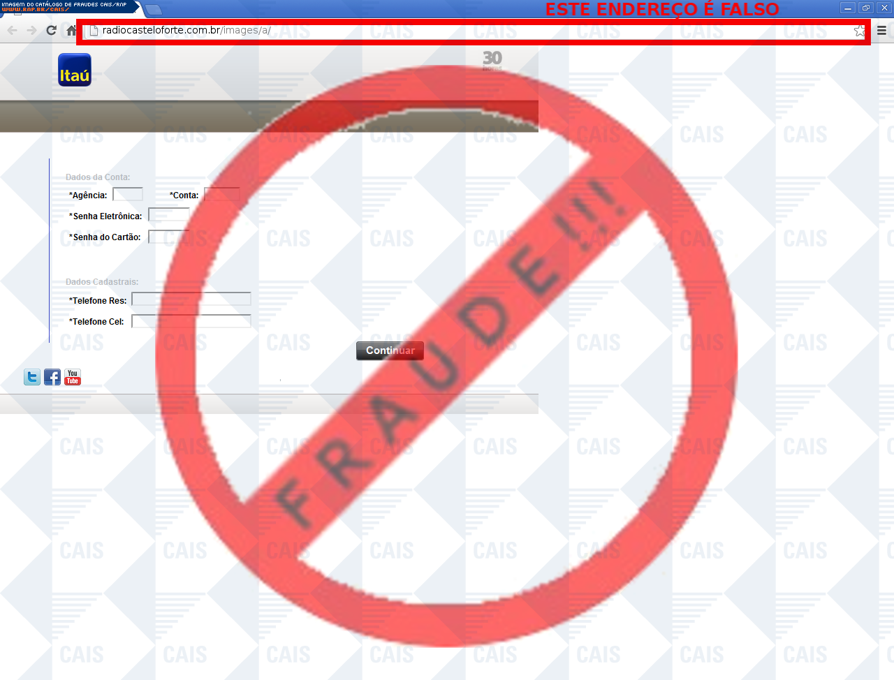 Esta página tem função informativa e educativa. Exibe uma coleção de imagens de phishing scam (fraudes eletrônicas) ou malware (código malicioso) veiculados por meio de spam (e-mail não-solicitado). Trata-se de conteúdo exemplificativo, não exaustivo, uma vez que não é possível contemplar todos os casos de fraudes existentes. Assim, caso você tenha conhecimento de um exemplar que não esteja aqui presente, isto não significa que não seja válido ou real. Inclusive incentivamos que você o envie para análise do CAIS para que, se for o caso, passe a integrar o nosso acervo.