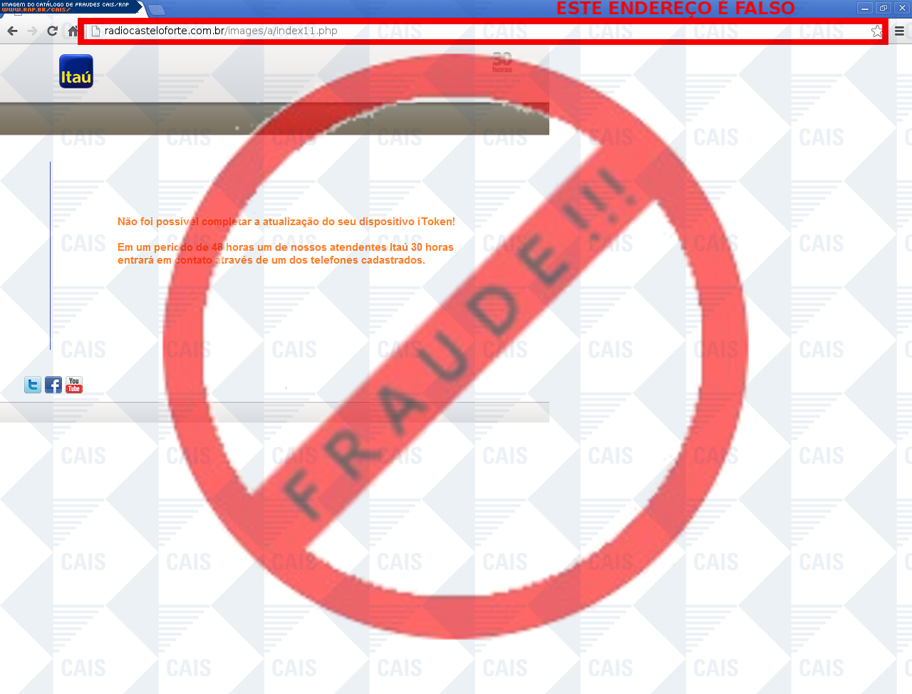 | comentário | O usuário recebe um e-mail contendo uma solicitação de atualização do seu dispositivo Itoken, mas quando acessa o link para executar o procedimento é levado para uma pagina falsa que solicita os seus dados tais como: Numero da agencia e conta corrente e senhas... (leia mais) | |