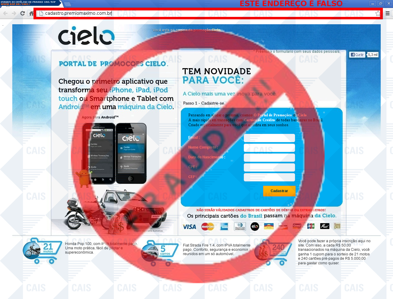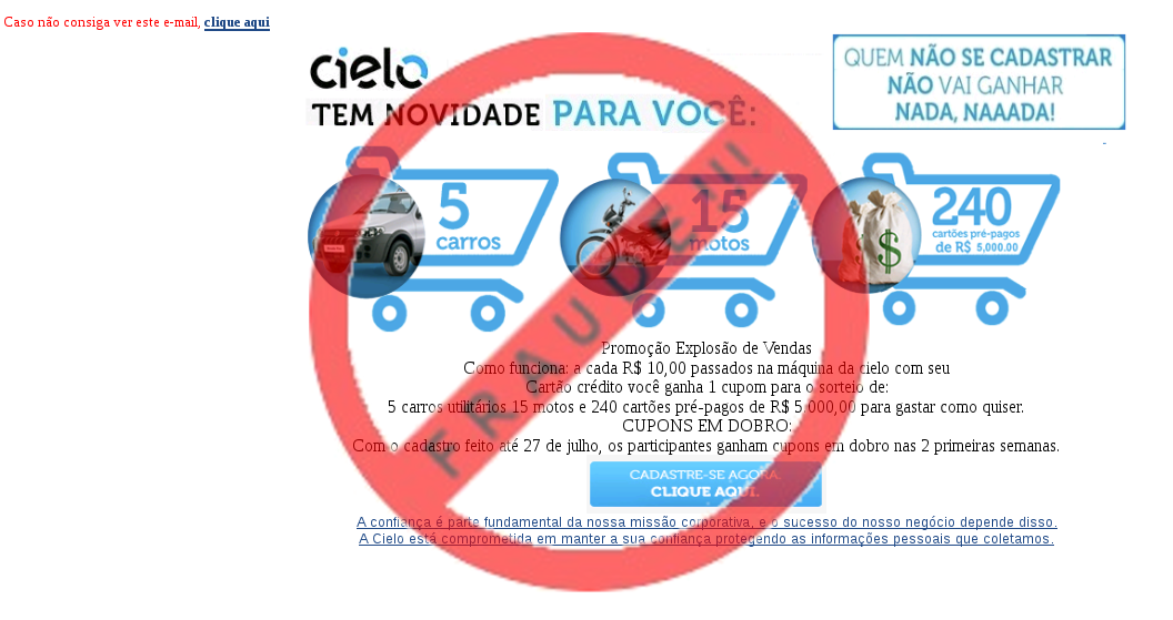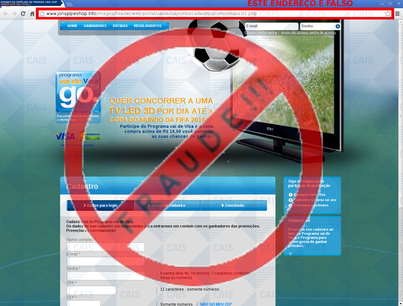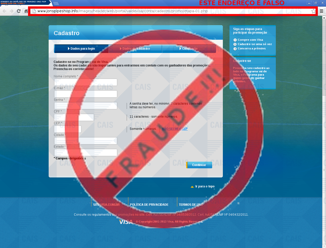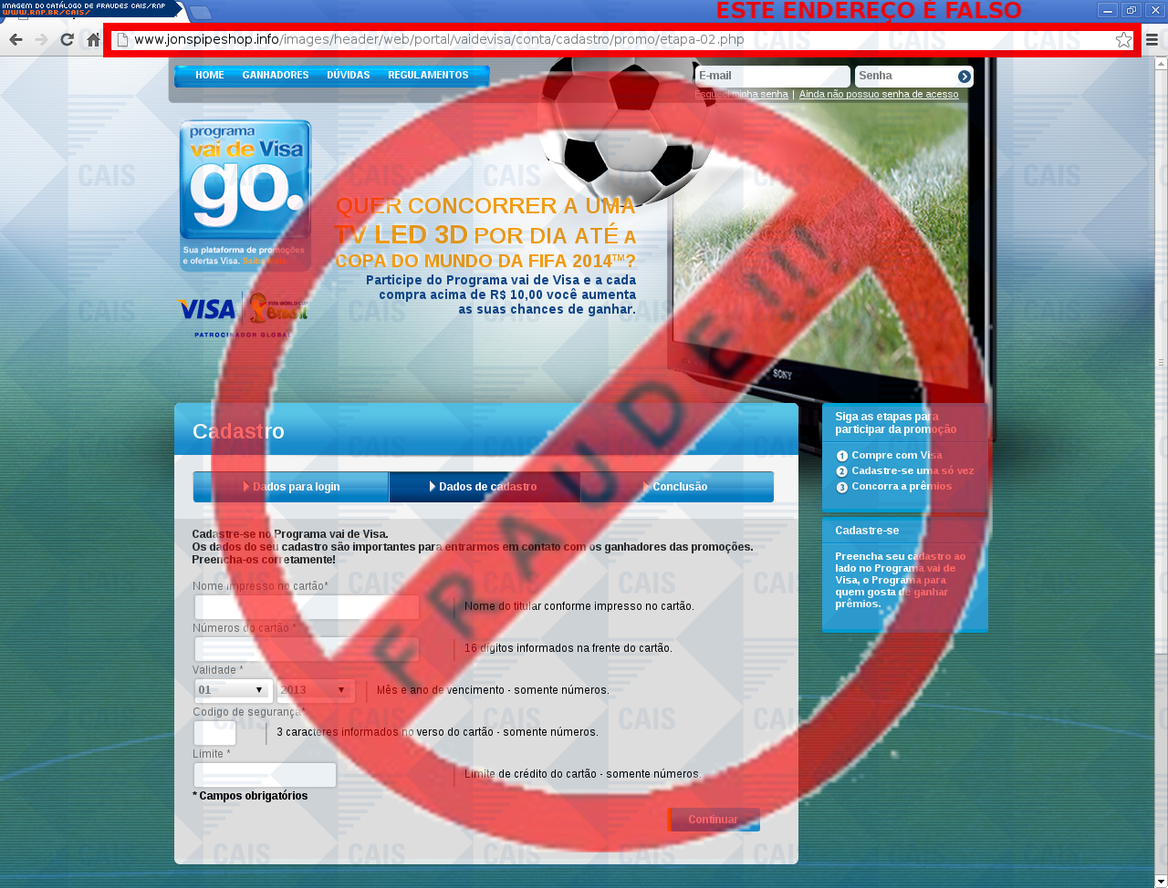 | comentário | O fraudador envia um e-mail do que seria uma promoção, mas o link para cadastramento leva o usuário a um site falso que solicita seus dados pessoais. | |