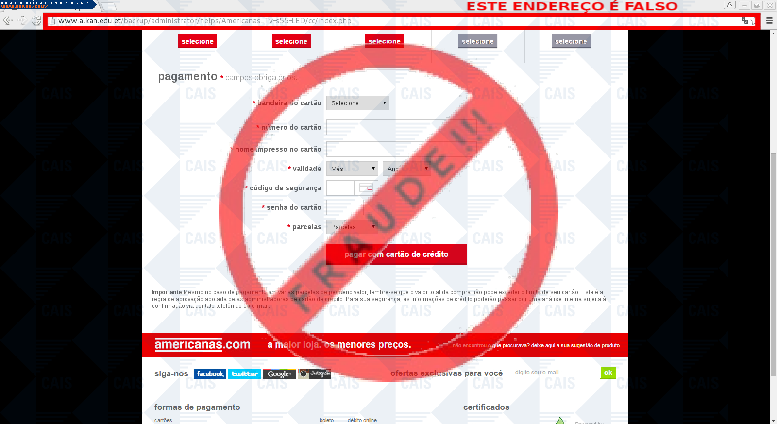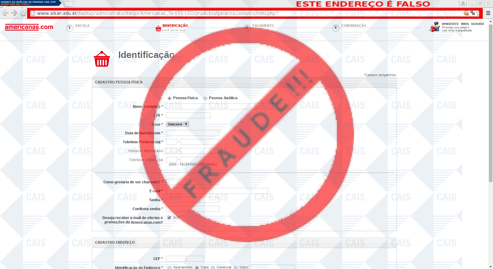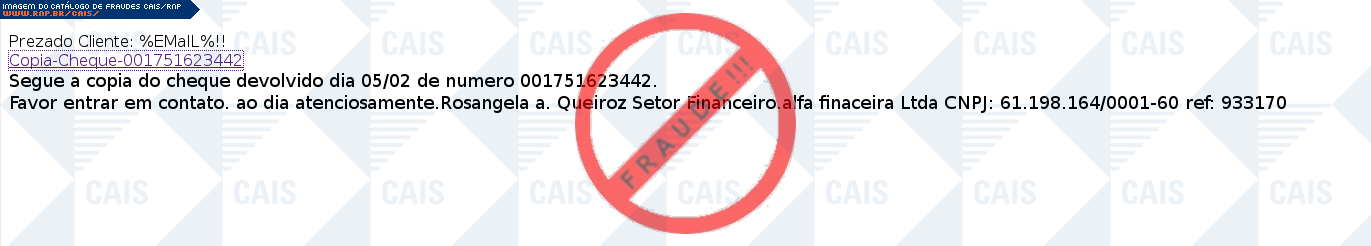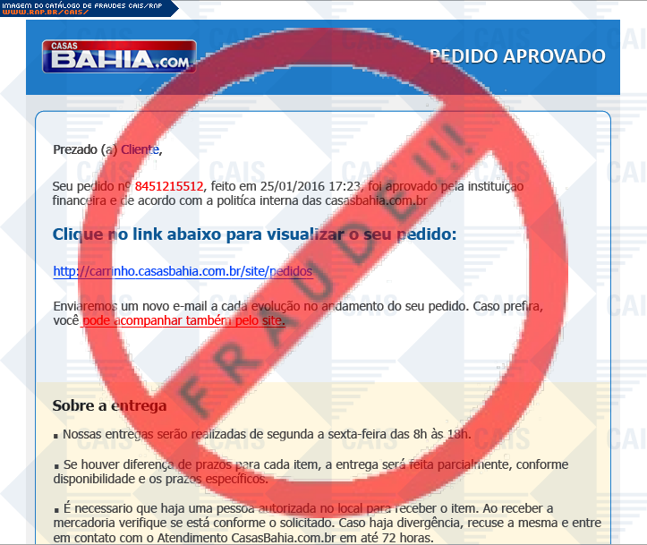 Esta página tem função informativa e educativa. Exibe uma coleção de imagens de phishing scam (fraudes eletrônicas) ou malware (código malicioso) veiculados por meio de spam (e-mail não-solicitado). Trata-se de conteúdo exemplificativo, não exaustivo, uma vez que não é possível contemplar todos os casos de fraudes existentes. Assim, caso você tenha conhecimento de um exemplar que não esteja aqui presente, isto não significa que não seja válido ou real. Inclusive incentivamos que você o envie para análise do CAIS para que, se for o caso, passe a integrar o nosso acervo.