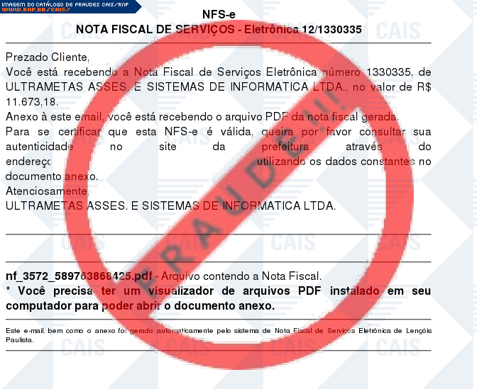 | comentário | A vítima recebe um email dizendo que em anexo há uma nota fiscal eletrônica relativa a serviços de informática. Entretanto, o anexo é na verdade um malware que tenta infectar a máquina da vítima. | |