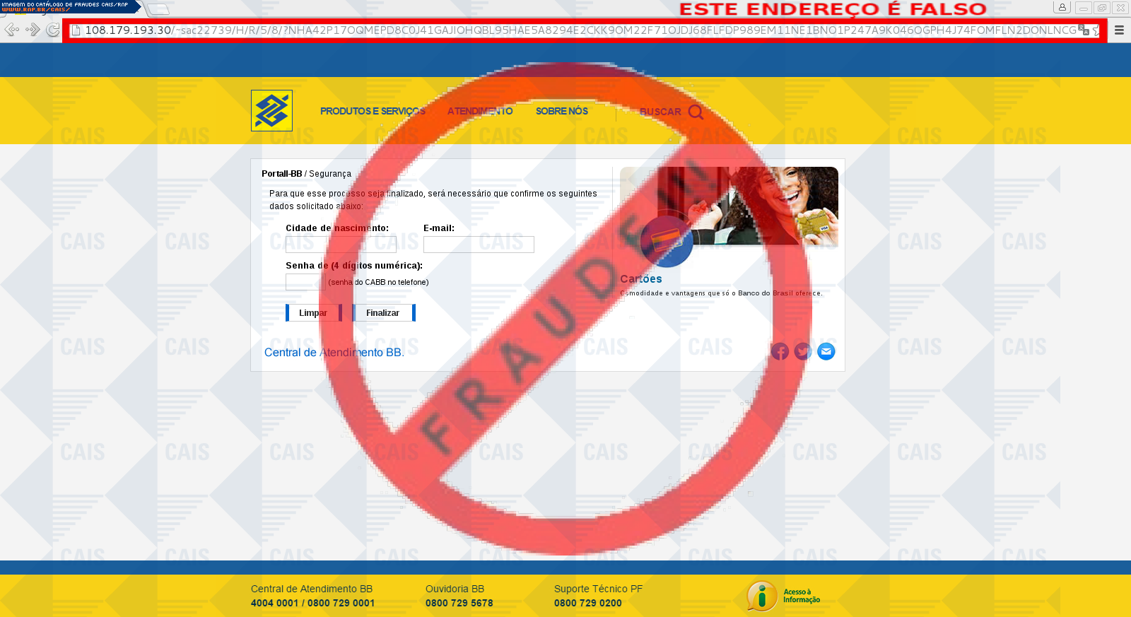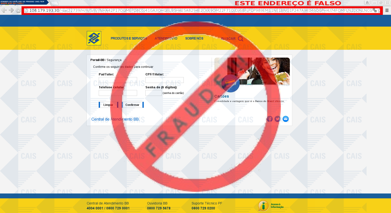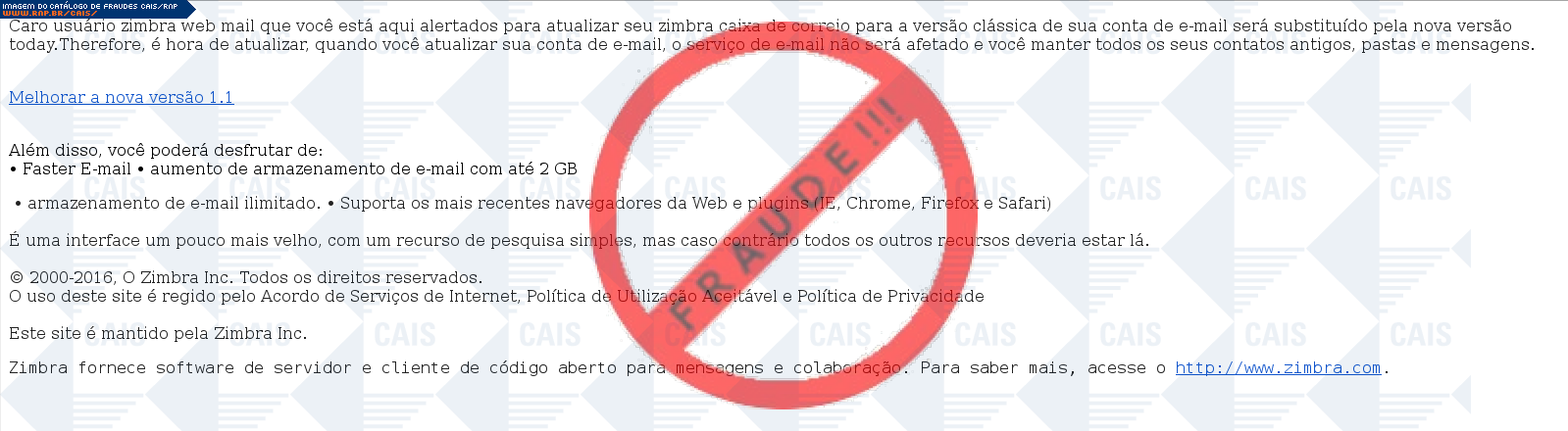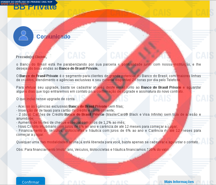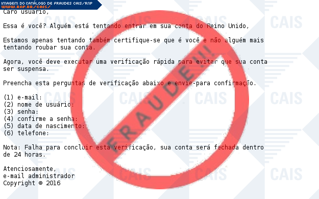 Esta página tem função informativa e educativa. Exibe uma coleção de imagens de phishing scam (fraudes eletrônicas) ou malware (código malicioso) veiculados por meio de spam (e-mail não-solicitado). Trata-se de conteúdo exemplificativo, não exaustivo, uma vez que não é possível contemplar todos os casos de fraudes existentes. Assim, caso você tenha conhecimento de um exemplar que não esteja aqui presente, isto não significa que não seja válido ou real. Inclusive incentivamos que você o envie para análise do CAIS para que, se for o caso, passe a integrar o nosso acervo.