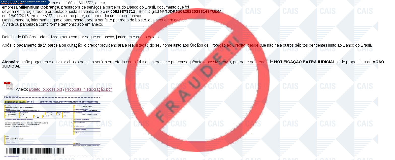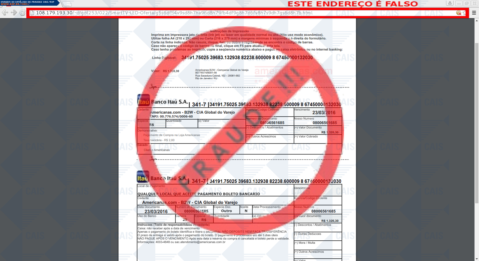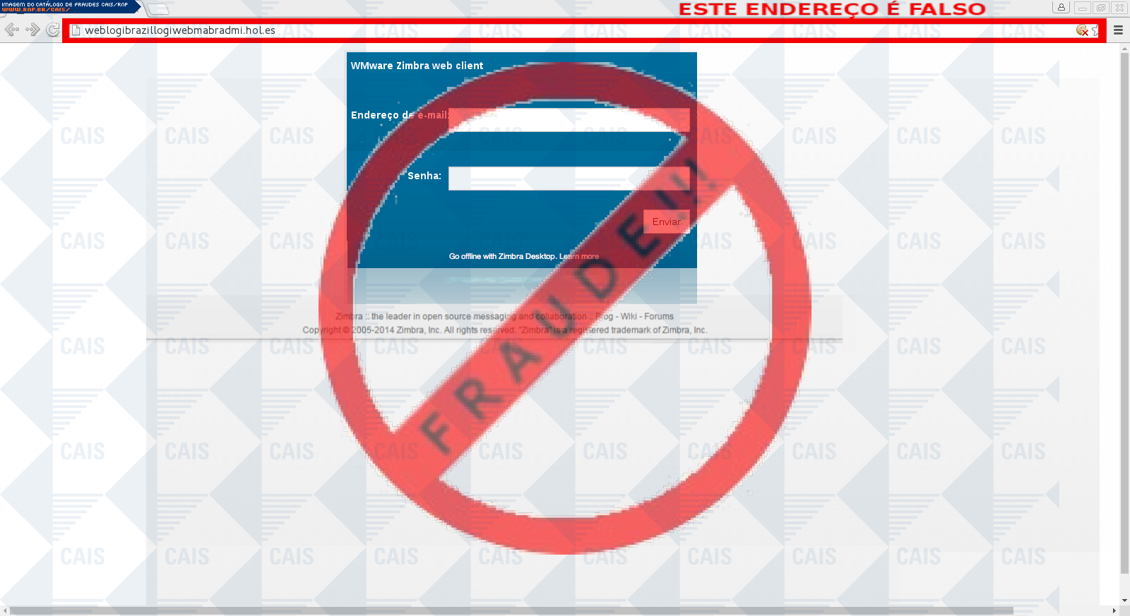 Esta página tem função informativa e educativa. Exibe uma coleção de imagens de phishing scam (fraudes eletrônicas) ou malware (código malicioso) veiculados por meio de spam (e-mail não-solicitado). Trata-se de conteúdo exemplificativo, não exaustivo, uma vez que não é possível contemplar todos os casos de fraudes existentes. Assim, caso você tenha conhecimento de um exemplar que não esteja aqui presente, isto não significa que não seja válido ou real. Inclusive incentivamos que você o envie para análise do CAIS para que, se for o caso, passe a integrar o nosso acervo.